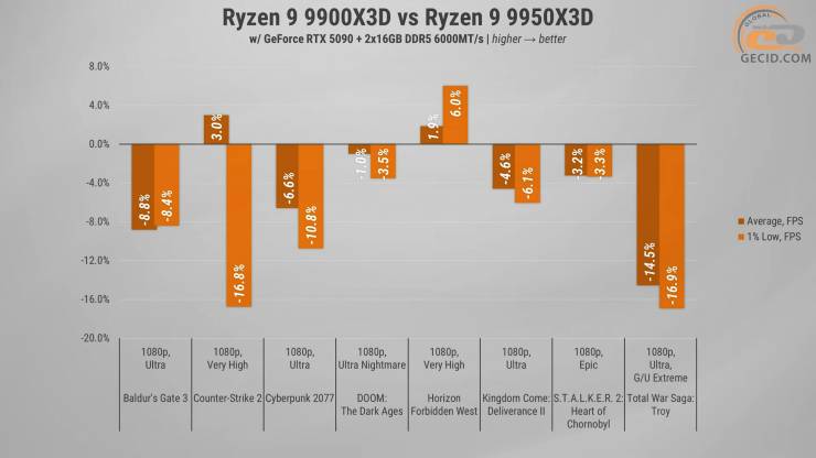 З іншого боку 9900X3D впевнено залишив позаду свою звичайну версію без додаткового кешу, на значні 26%. А до 9950X3D піддослідна модель не дотягнула зовсім трохи, але різниця там мінімальна і навряд чи стане помітною під час гри.