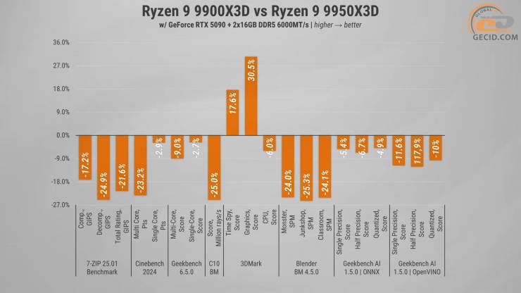 Наостанок, в AI-обчисленнях Ryzen 9 9900X3D показав себе впевнено, але не без сюрпризів. Він тримався близько до 9900X і поступився 9950X3D у межах 12% в середньому.