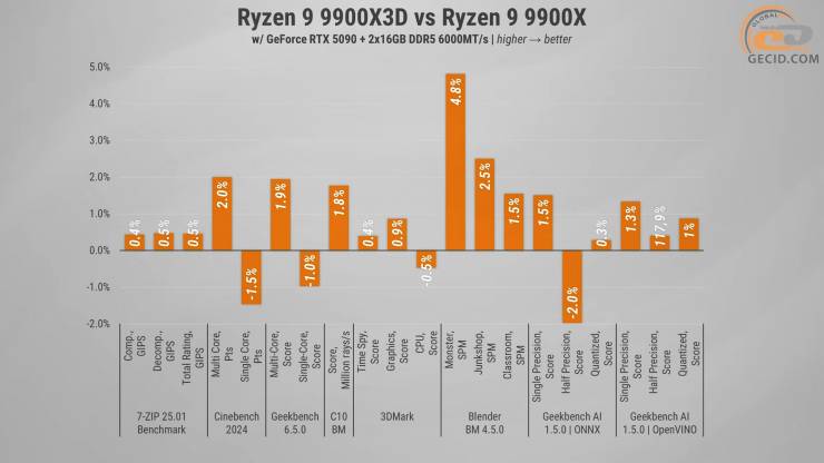 Втім, тут вистрілив 9800X3D — його одночиплетна структура і частоти в окремих AI-сценаріях дають фору навіть старшим моделям, і місцями він вийшов беззаперечним лідером.