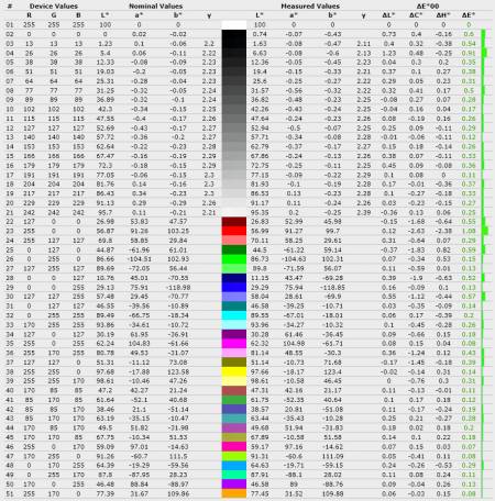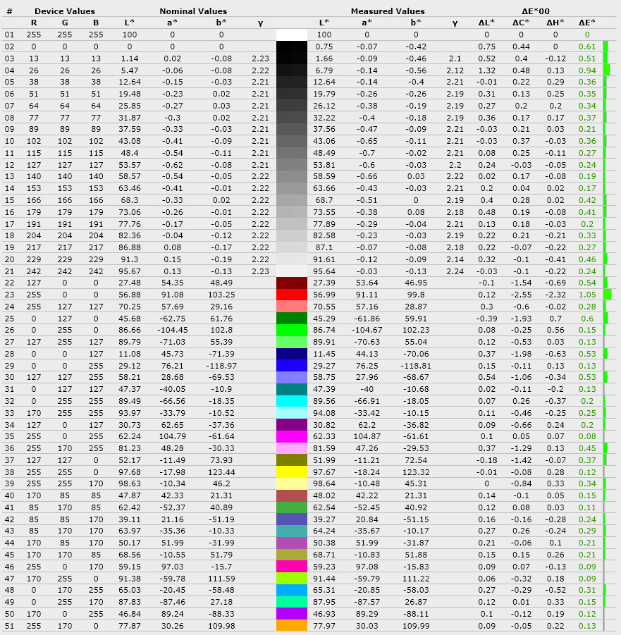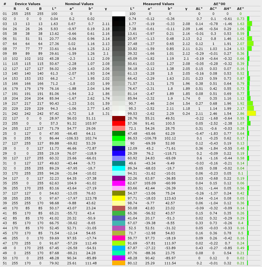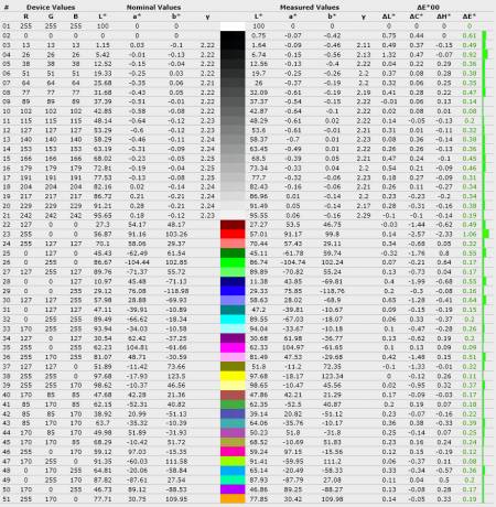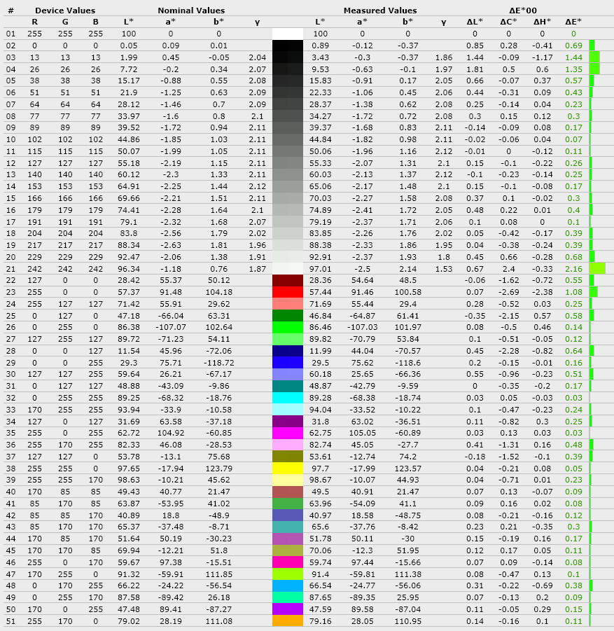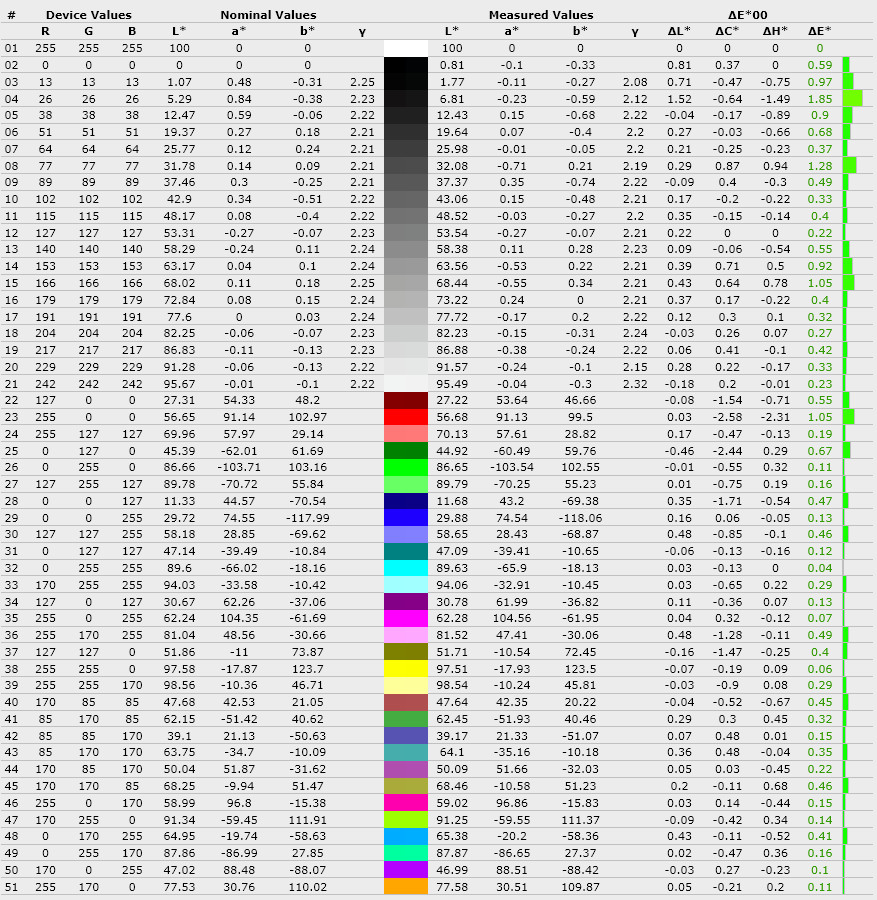 Інші параметри — охоплення sRGB (100,0%), Adobe RGB (85,7%), об’єм sRGB (146,1%), Adobe RGB (100,7%) — залишились високими або знизились несуттєво. Середнє відхилення ∆E*94 зросло з 0,28 до 0,42, максимальне — з 1,09 до 1,85, але обидва значення залишаються в межах професійної норми. Гама вирівнялась до 1,97, без характерного зсуву кривої вище еталонної.