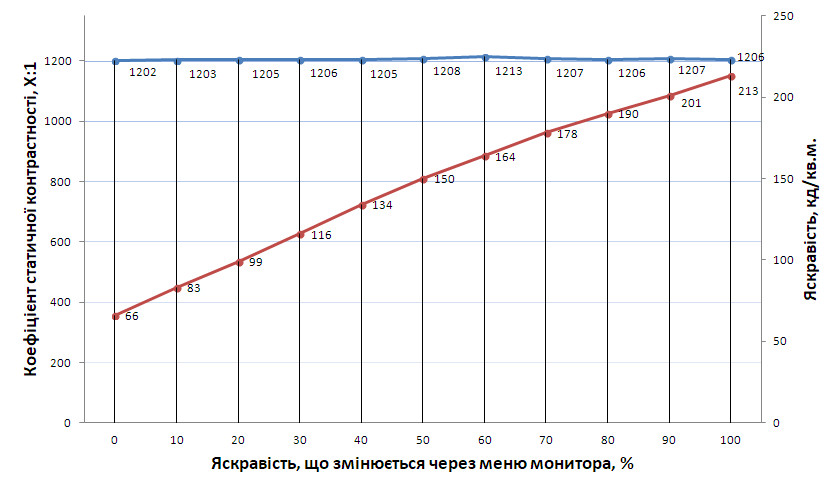 Діапазон зміни яскравості охоплює значення від 66 до 213 кд/м², що забезпечує базову універсальність для роботи в різних умовах. Мінімальна яскравість — досить висока, тому монітор умовно придатний для нічної роботи лише за умови наявності фонового освітлення за екраном. Максимальна яскравість — 213 кд/м² — перебуває на межі достатнього для комфортної роботи в денному середовищі без прямого сонячного світла.