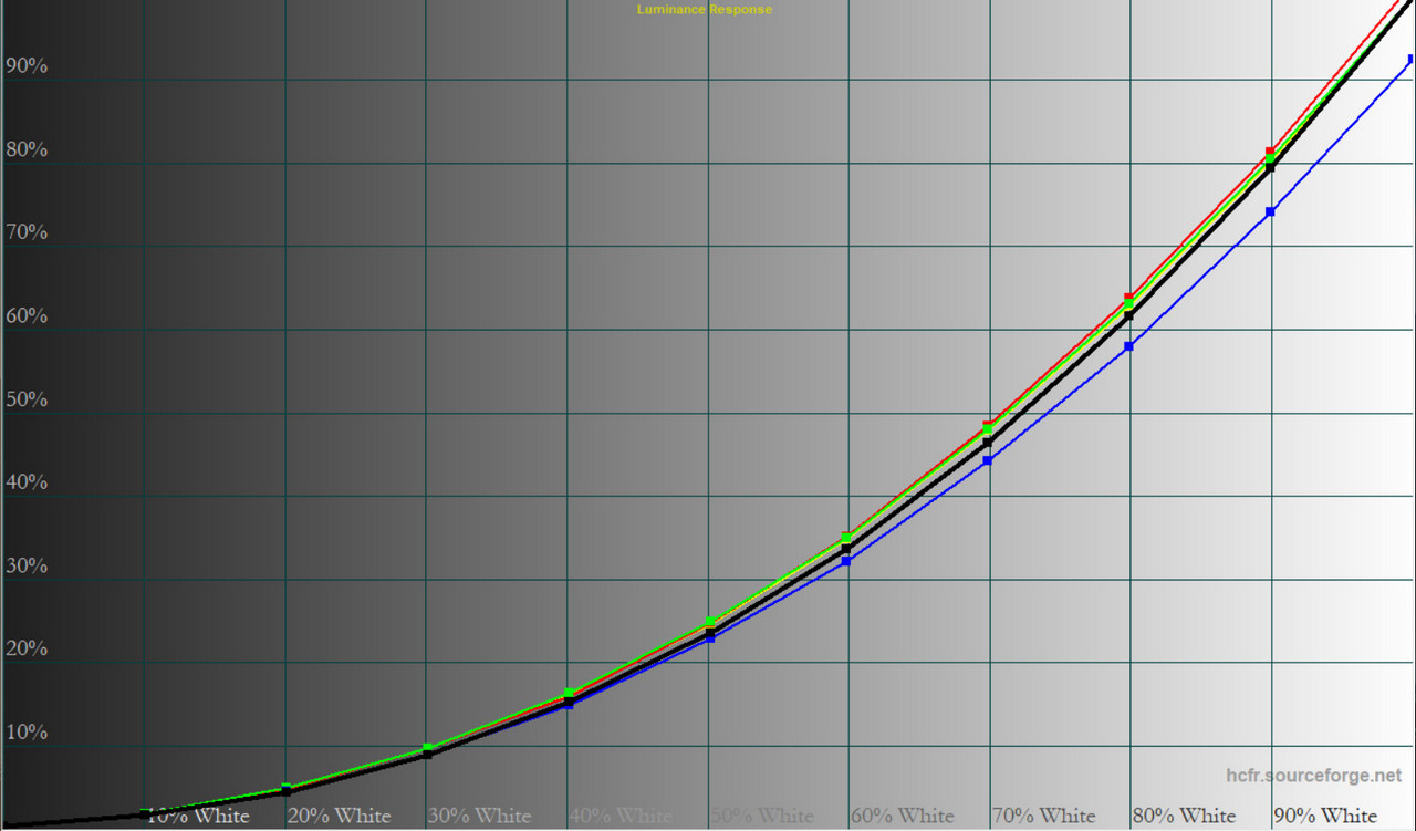 Кольорові складові синхронізовані: червона та зелена проходять трохи вище еталону, синя — стабільно нижче. Це зумовлює легкий теплий зсув у градаціях: тіні виглядають м’якше, зображення — менш контрастним, а півтони — трохи спрощеними. Водночас форма кривої залишається стабільною, без втрати деталізації.
