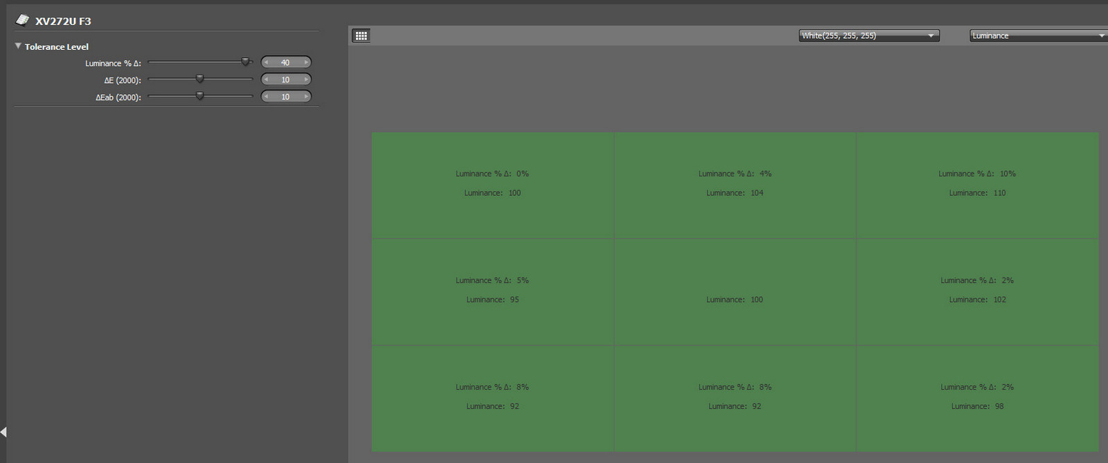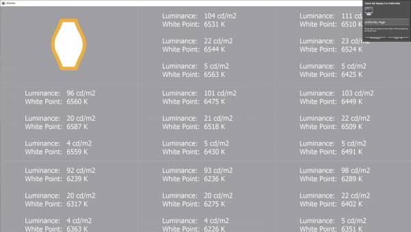 Максимальне відхилення яскравості щодо центральної ділянки становило 10 кд/м², або 10%, що є відмінним показником для IPS-панелі. Немає критичних провалів чи локальних піків — яскравість розподілена рівномірно по всій площині, з плавним переходом між зонами.