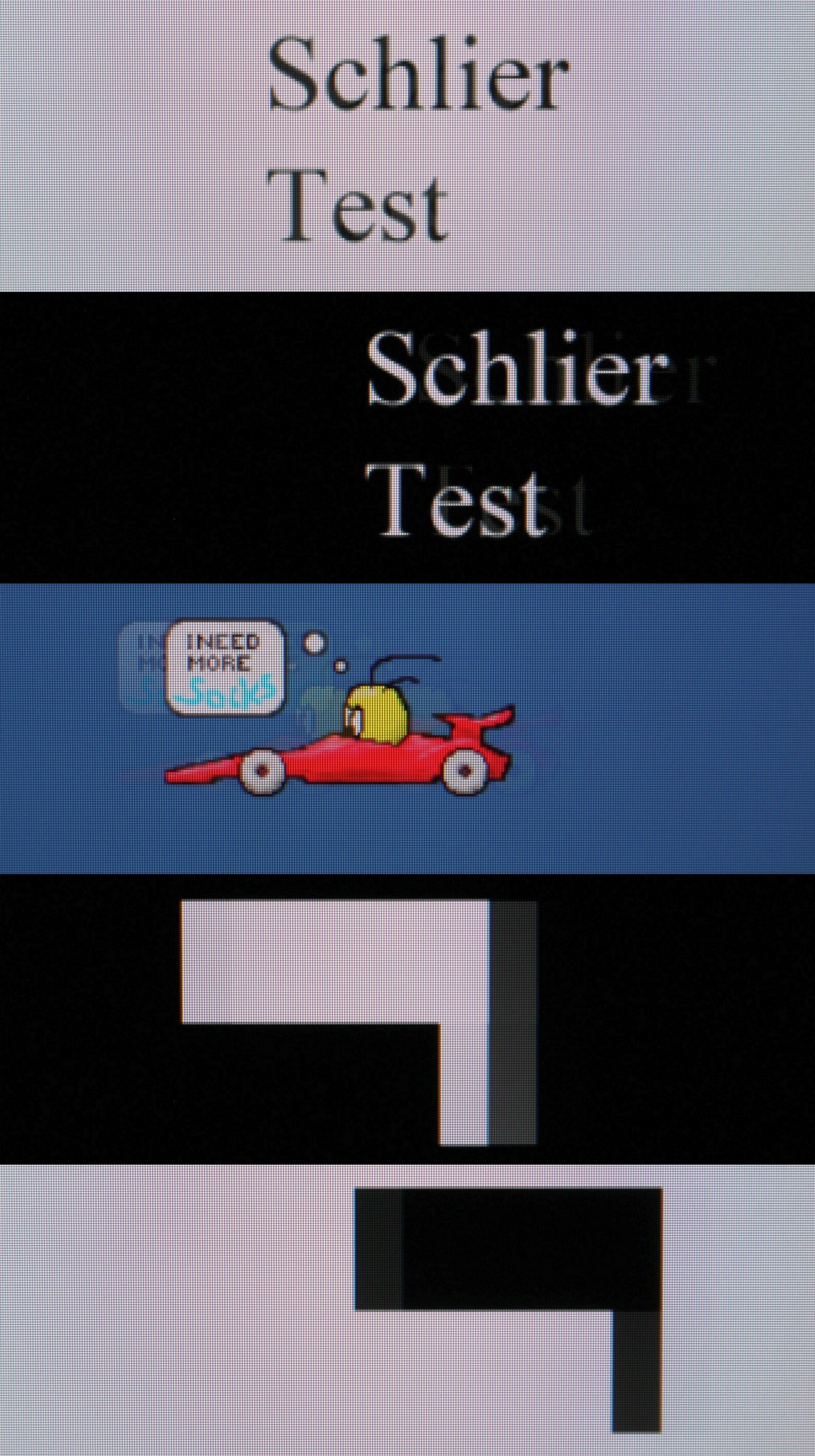 Під час Schlieren-тесту зафіксовано помірні шлейфи на темних переходах, а також легкі артефакти розгону — переважно в зоні з прямокутниками та машинкою. Це типовий сценарій для IPS-панелей: темні градації обробляються з невеликою інерцією, але без критичних затримок. У порівнянні з попередніми поколіннями, сучасні IPS демонструють суттєвий прогрес у швидкості, особливо при високих частотах оновлення.