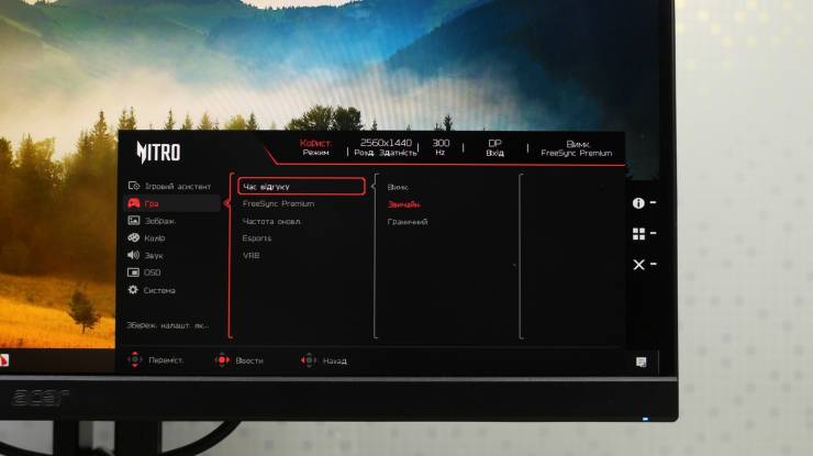 Монітор підтримує фірмову технологію Acer VRB (Visual Response Boost) — вставку чорного кадру для зменшення розмиття в русі. У меню доступні три режими: Вимкнено, Звичайний і Граничний. Чим вищий рівень, тим чіткіше виглядає динаміка, але тим нижча яскравість. У цьому режимі заявлено мінімальний час відгуку 0,5 мс GtG, однак це лабораторне значення, досяжне лише в контрольованих умовах.