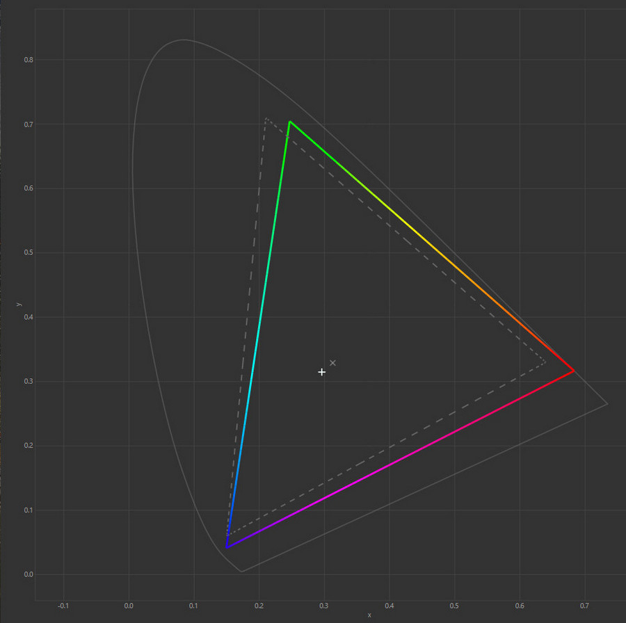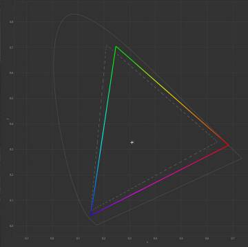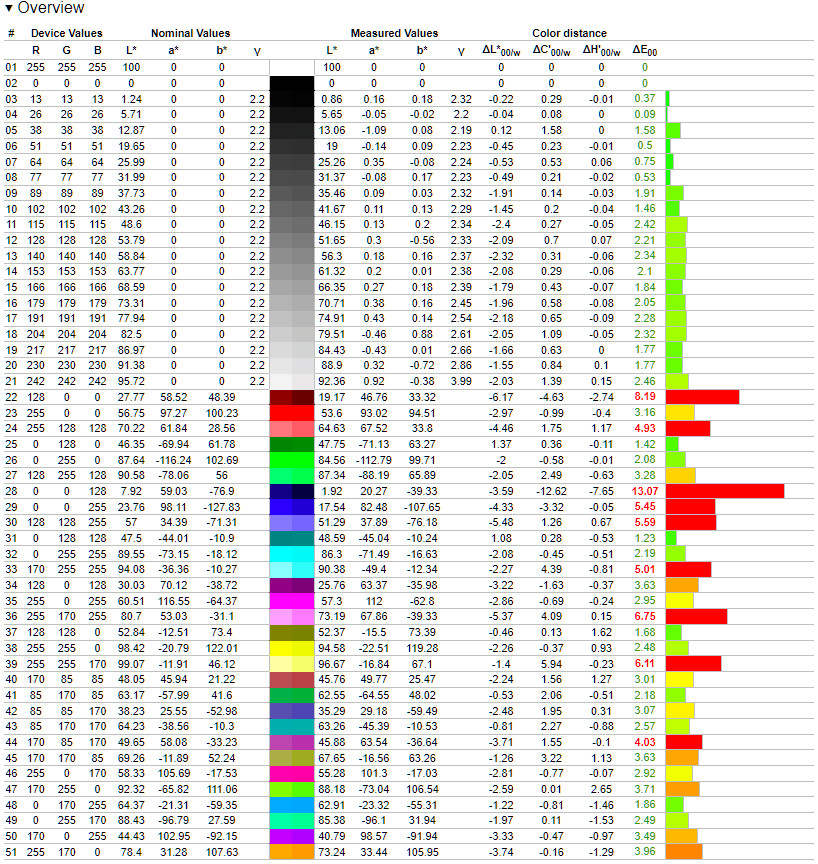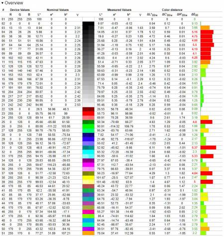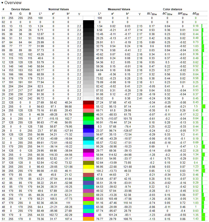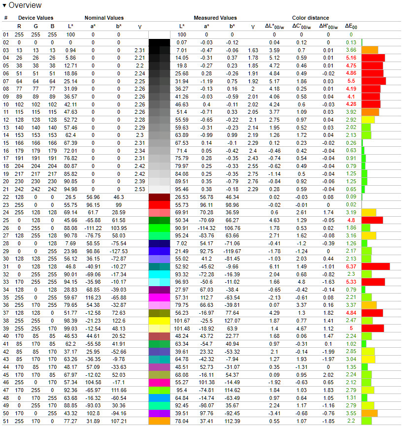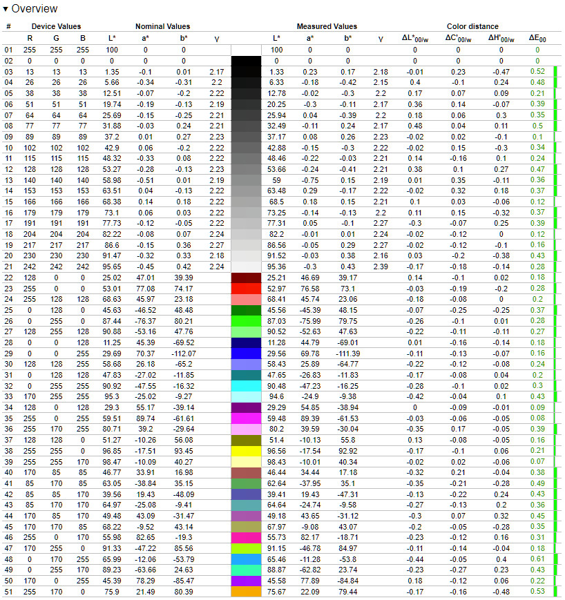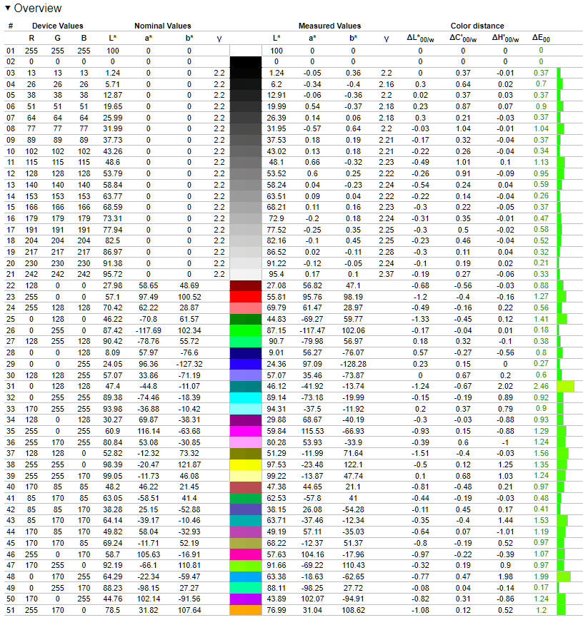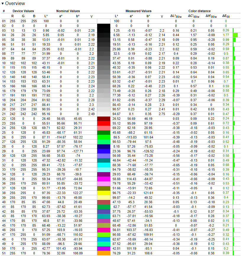 Точність кольорів суттєво погіршилась, хоча й лишилась у межах допусків: середнє ∆E зросло майже удвічі, а максимальне перевищило 2. Для ігор чи мультимедіа це не критично, але для роботи з графікою заводський «User» лишається точнішим.