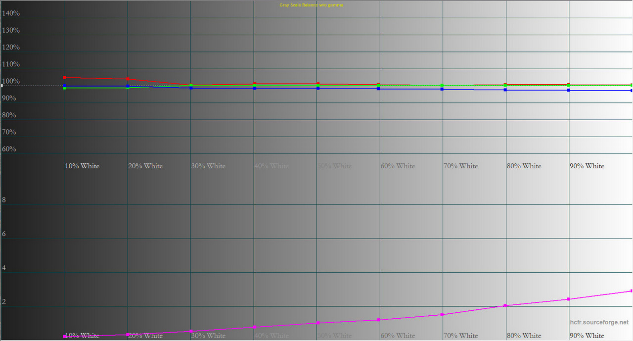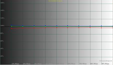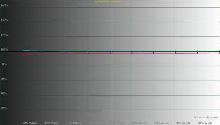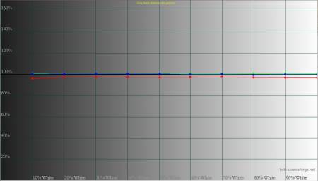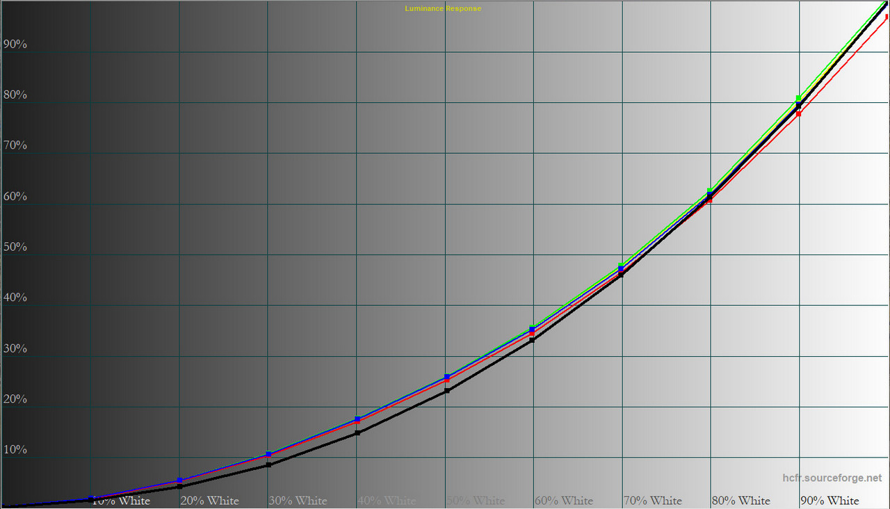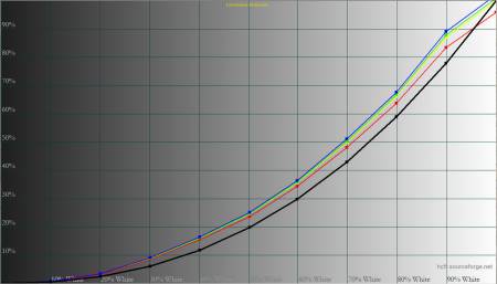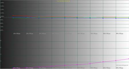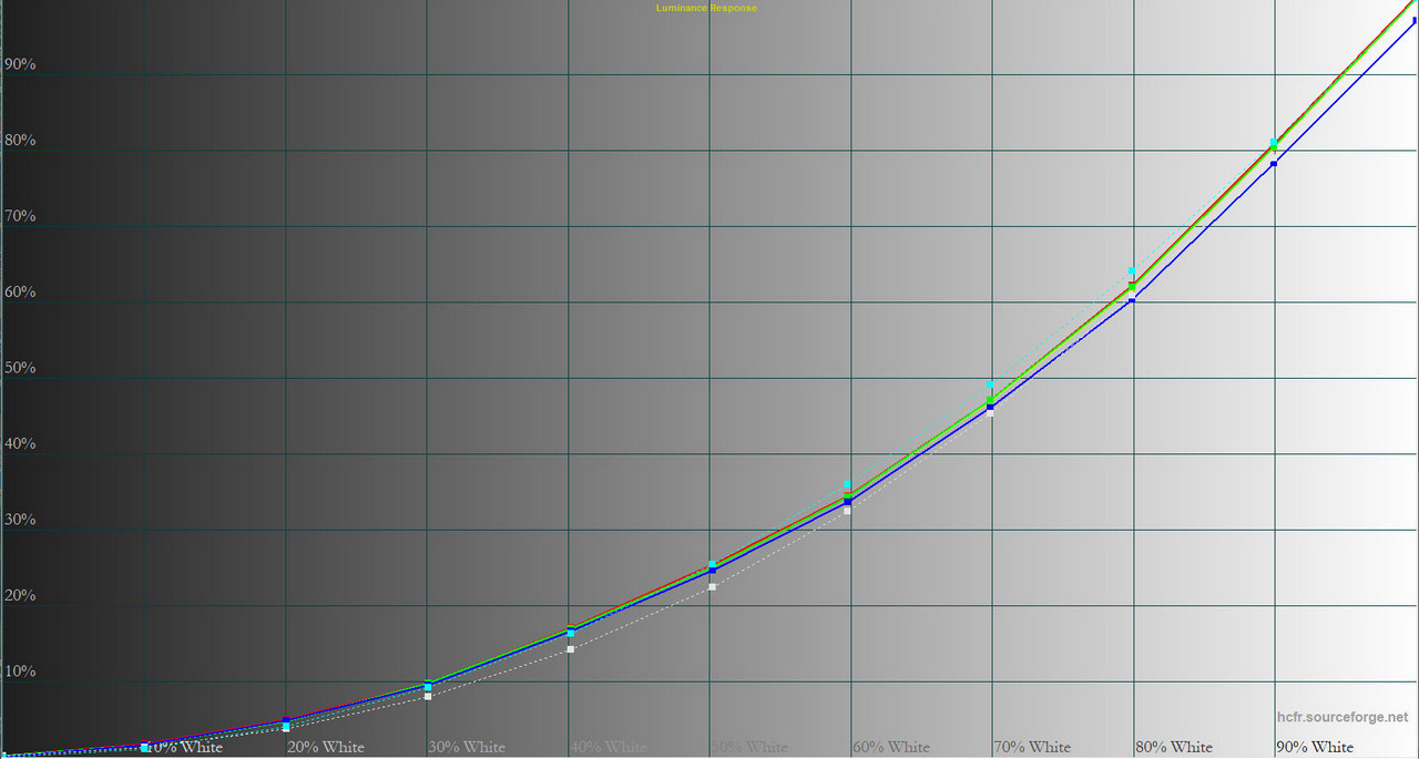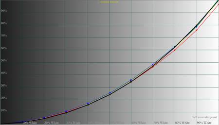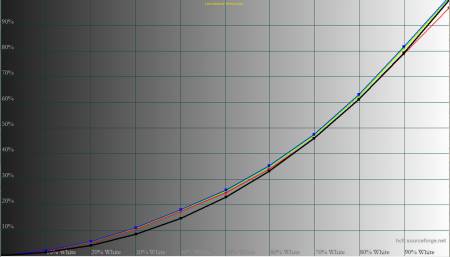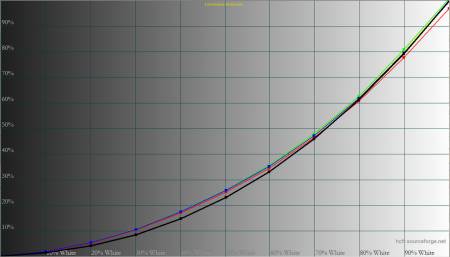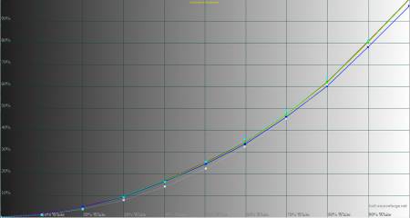 У більшості режимів середня гама тримається в межах 1,93–2,01, але форма кривих не завжди збігається з еталонною 2,2, що іноді дає пересвічування світлих відтінків. Кольорові канали не зливаються в одну криву.