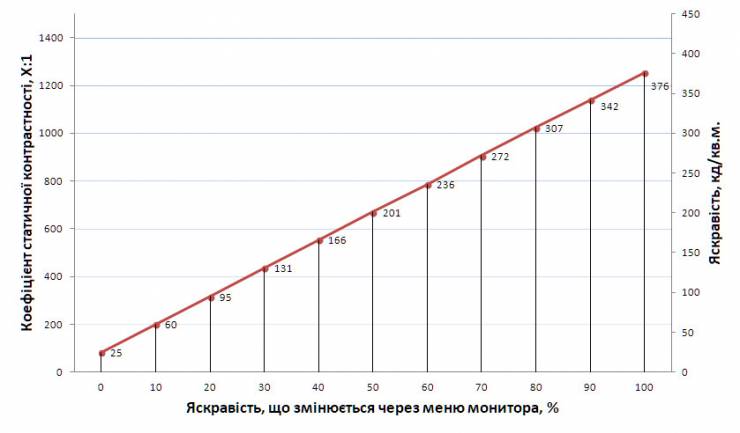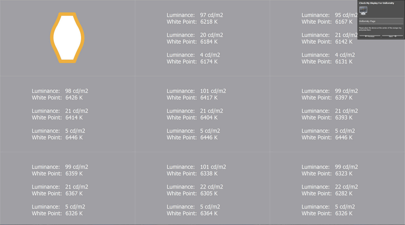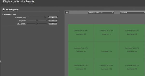 Максимальне відхилення яскравості щодо центральної ділянки становить 6 кд/м² чи 5%, що є чудовим показником для OLED-моніторів.