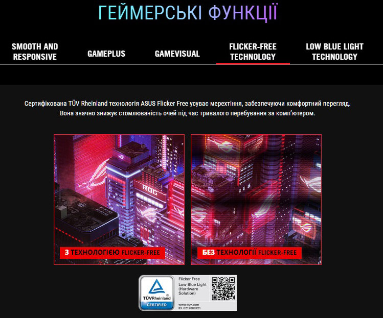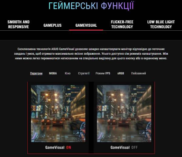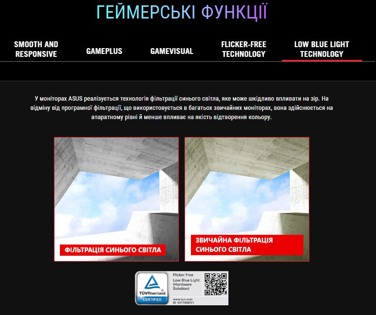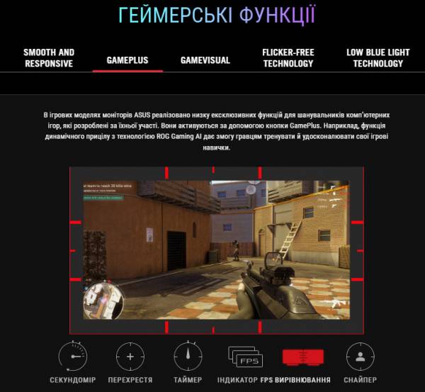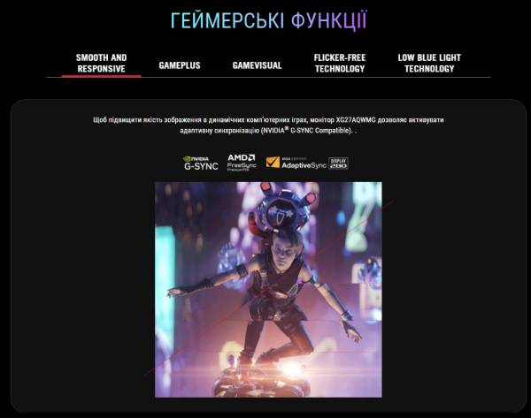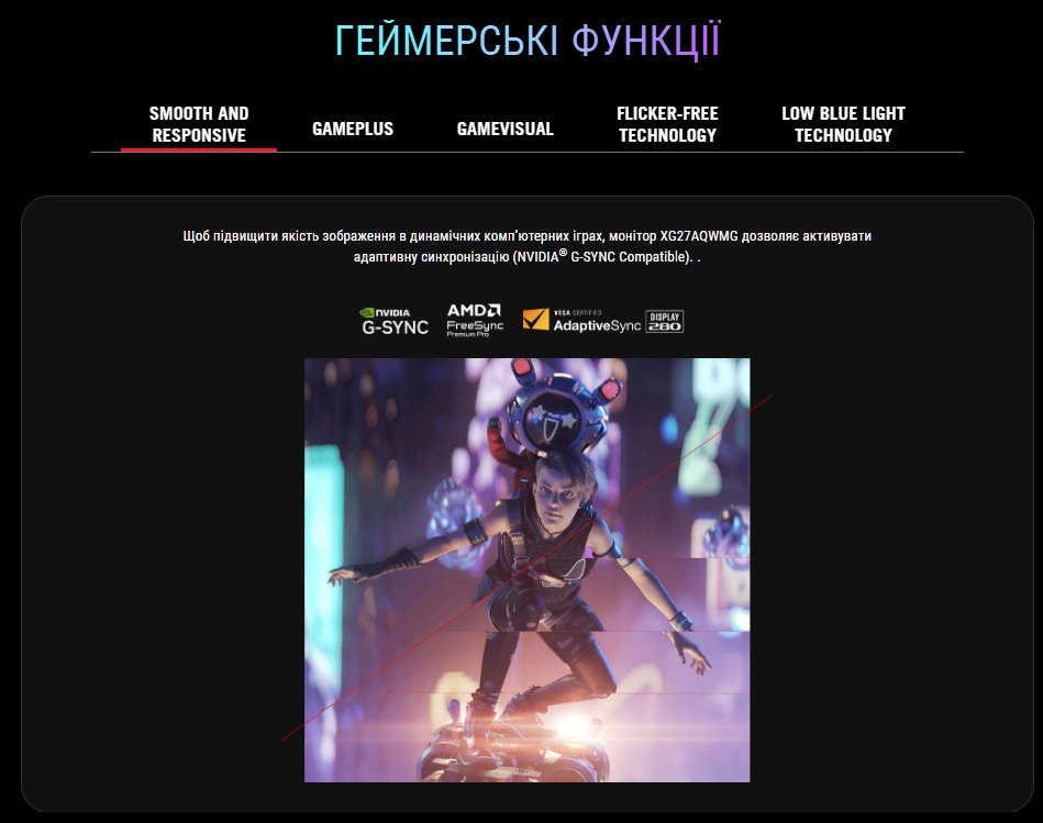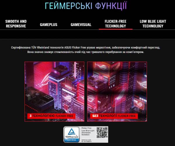 Окрім традиційних для всіх ігрових моніторів ASUS технологій, у цій моделі реалізовано цілий ряд технологічних рішень.
