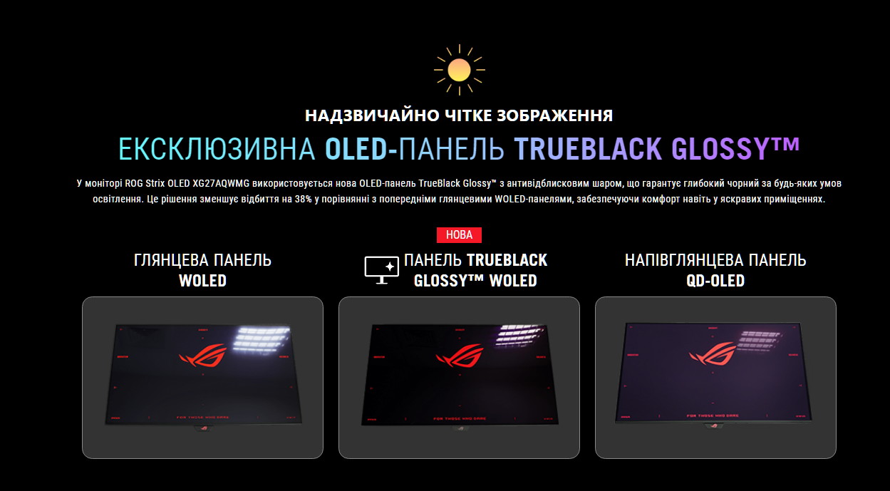 Панель має ексклюзивне глянцеве покриття TrueBlack Glossy з поляризатором, яке зменшує відбиття й дозволяє чорному залишатися глибоким навіть у яскраво освітлених приміщеннях. Пікова HDR‑яскравість перевищує 1500 кд/м² — приблизно на 15% більше за попередні моделі, і це добре відчувається у динамічних сценах.
