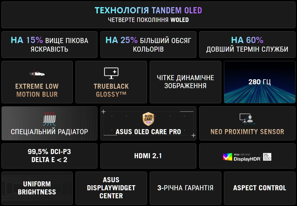 - комплекс ASUS OLED Care Pro: Pixel Shift, Logo Dimming, Screen Saver, автоматичне відновлення пікселів, Neo Proximity Sensor;