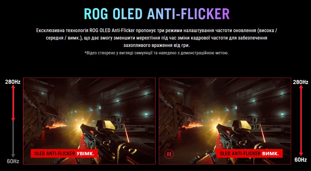 Усі OLED‑панелі мають одну спільну проблему — при зміні кадрової частоти може з’являтися помітне мерехтіння. У динамічних іграх це особливо відчутно: картинка ніби «пульсує», і занурення у процес порушується. ASUS вирішив цю проблему власною технологією ROG OLED Anti‑Flicker. Вона пропонує три режими — високий, середній та вимкнений. При її активації навіть на середньому рівні мерехтіння практично зникає, і картинка залишається стабільною. У швидких шутерах це дає відчутну перевагу — немає неприємного мерехтіння і грати стає комфортніше.
