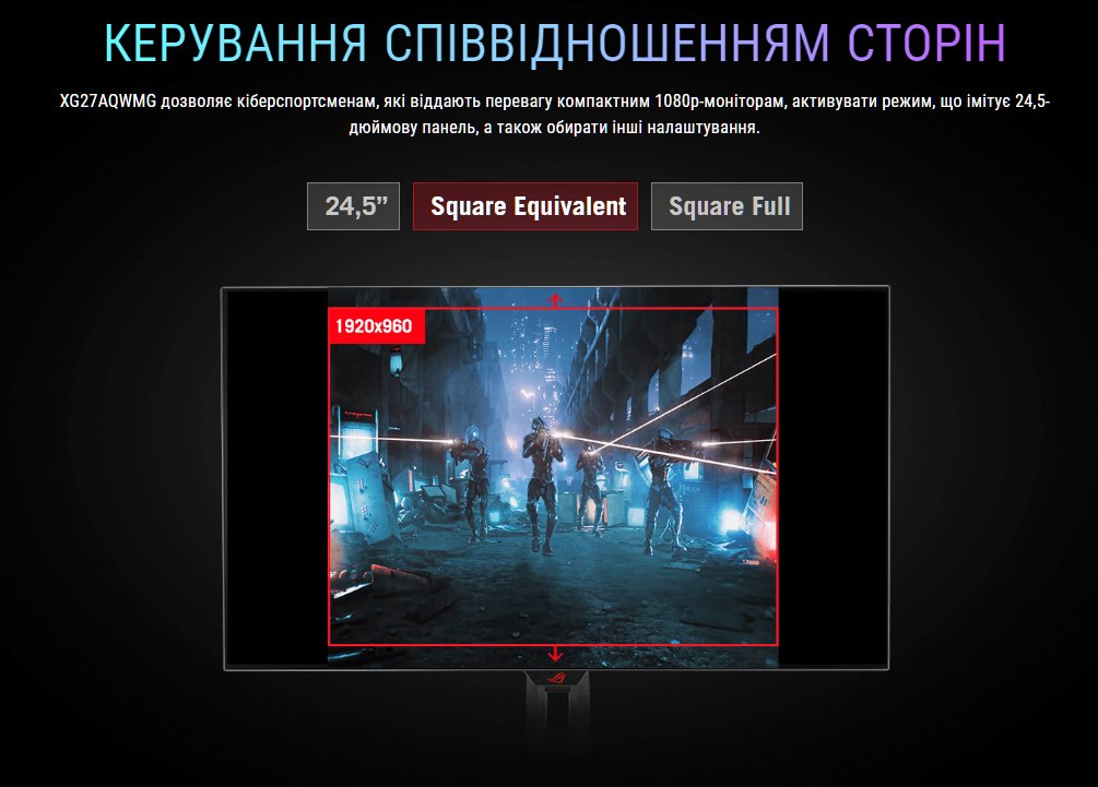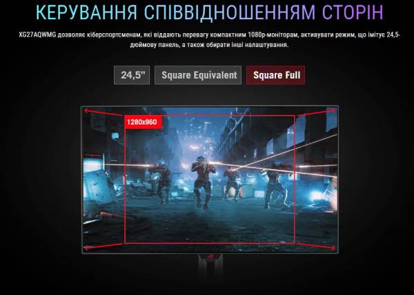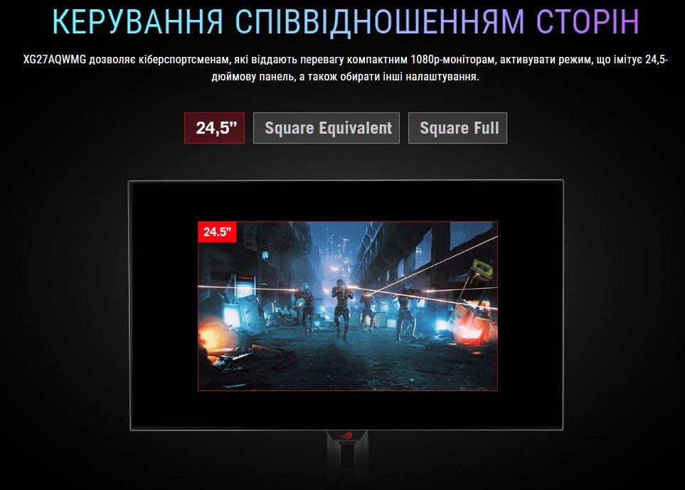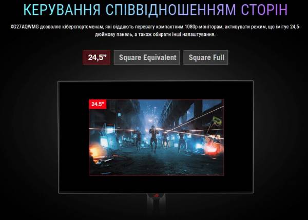 Монітор може відображати картинку у форматі 4:3 або зменшувати діагональ до 24,5 дюймів. У шутерах це дає відчутну перевагу — цілі виглядають більшими й їх легше уражати.