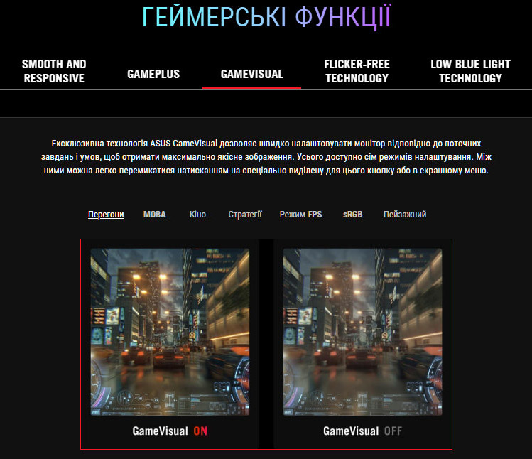 Так, режими Пейзаж / Перегони / Кіно / RTS/RPG / FPS / sRGB / MOBA / Нічний режим/Користувач |