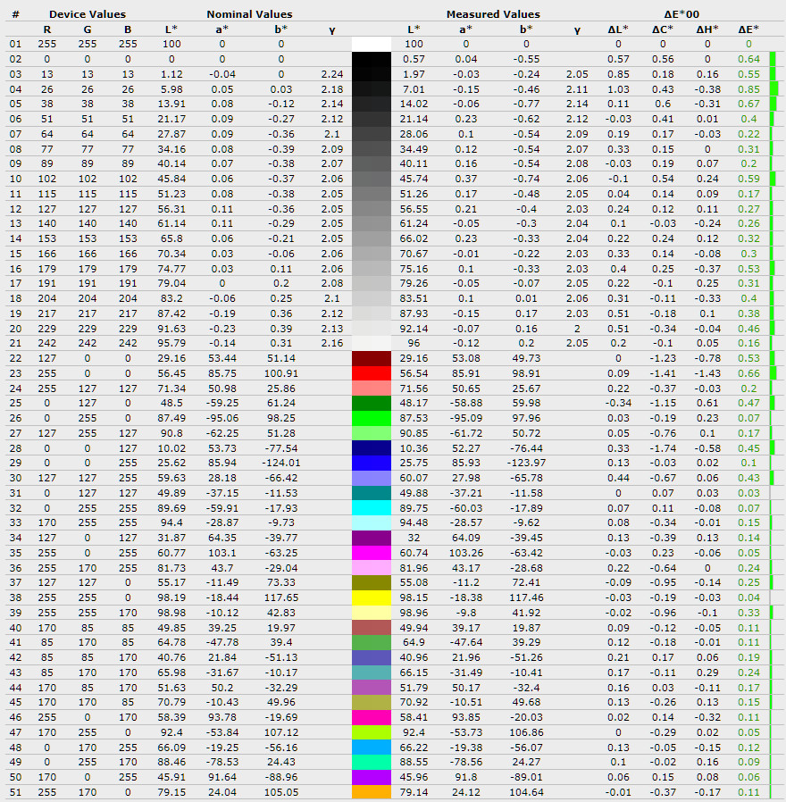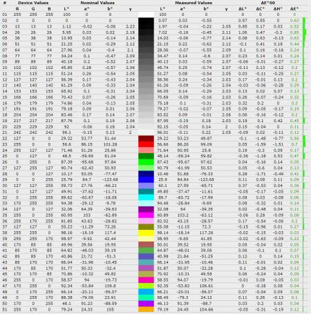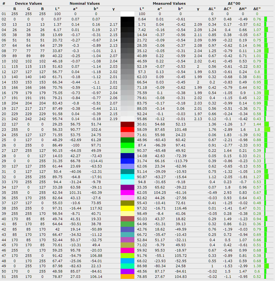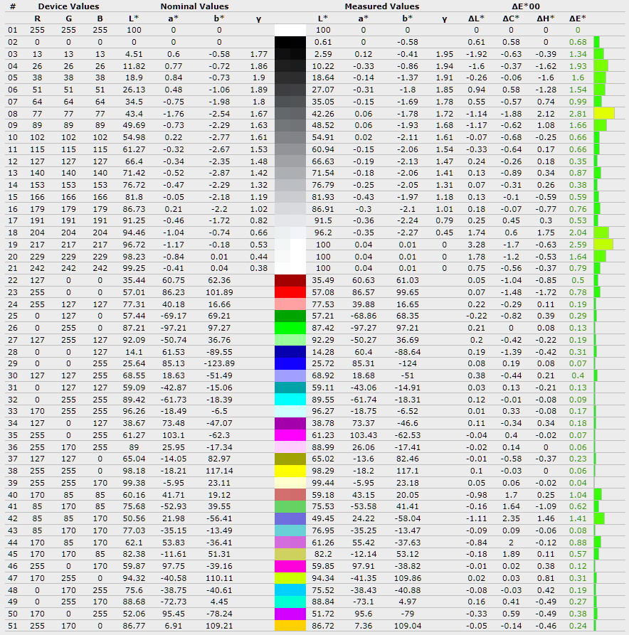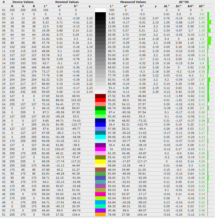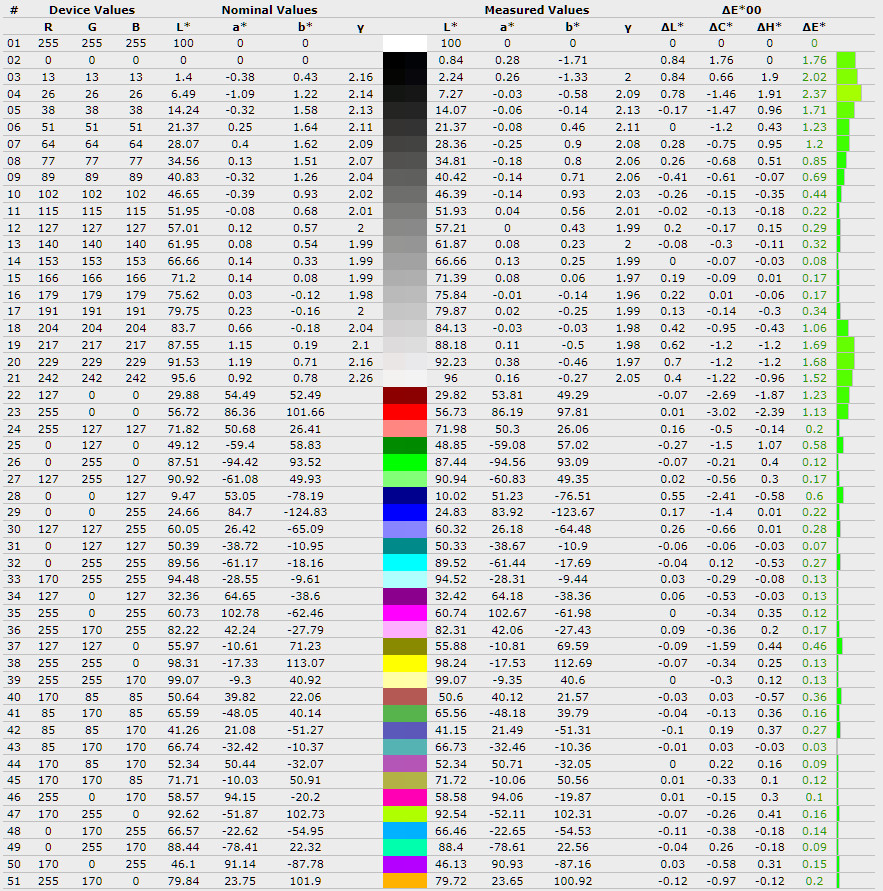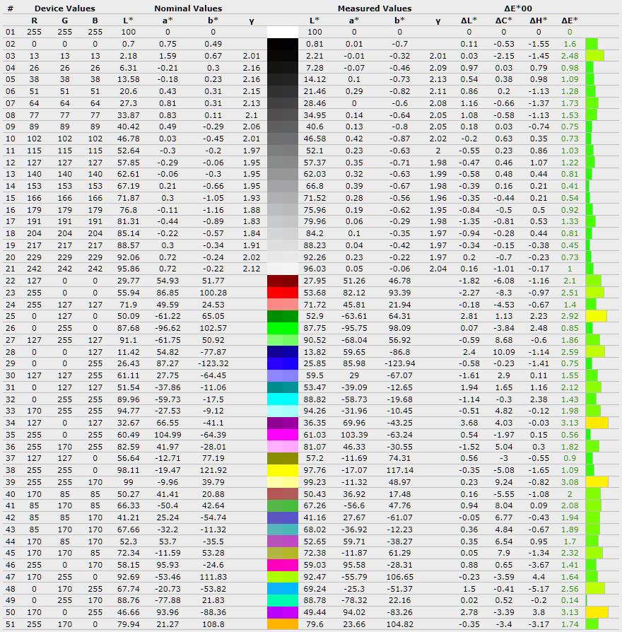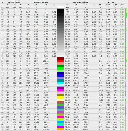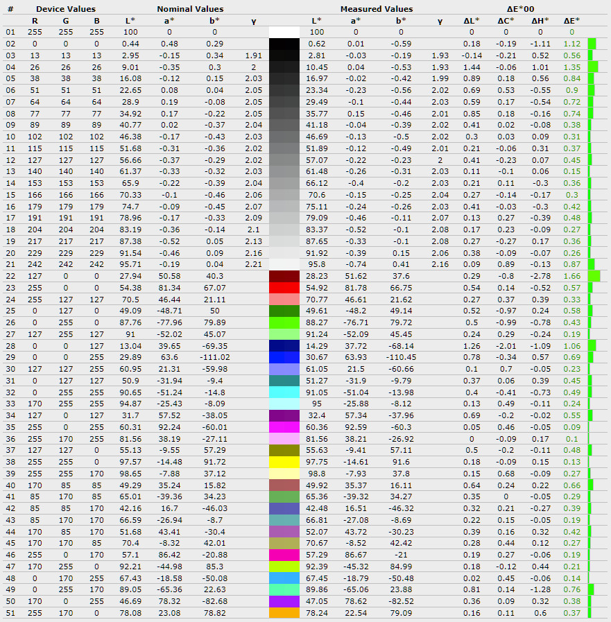 Середнє відхилення ∆E*00 піднялось з 0,27 до 0,39, а максимальне зросло з 0,85 до 1,5, що означає появу більш помітних відхилень у деяких відтінках. Середня гама залишилась на рівні 1,85, без суттєвих змін і все ще нижчою за еталонні 2,2.
