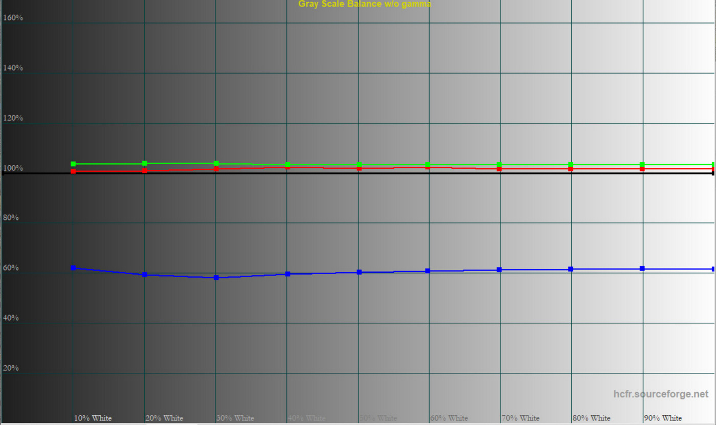 Винятком є профіль Pr‑Anti Blue, де синій канал суттєво занижений — приблизно до 60% від еталонного рівня. Це різко теплішає картинку, роблячи його жовтуватим, що відповідає призначенню режиму (захист очей).