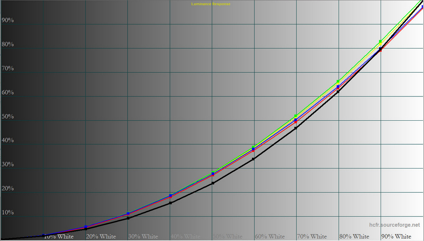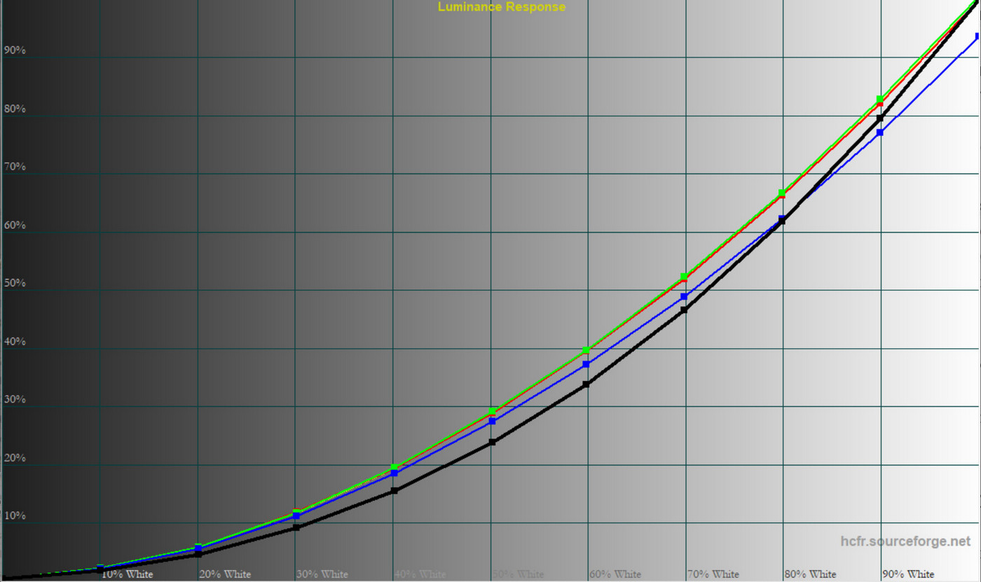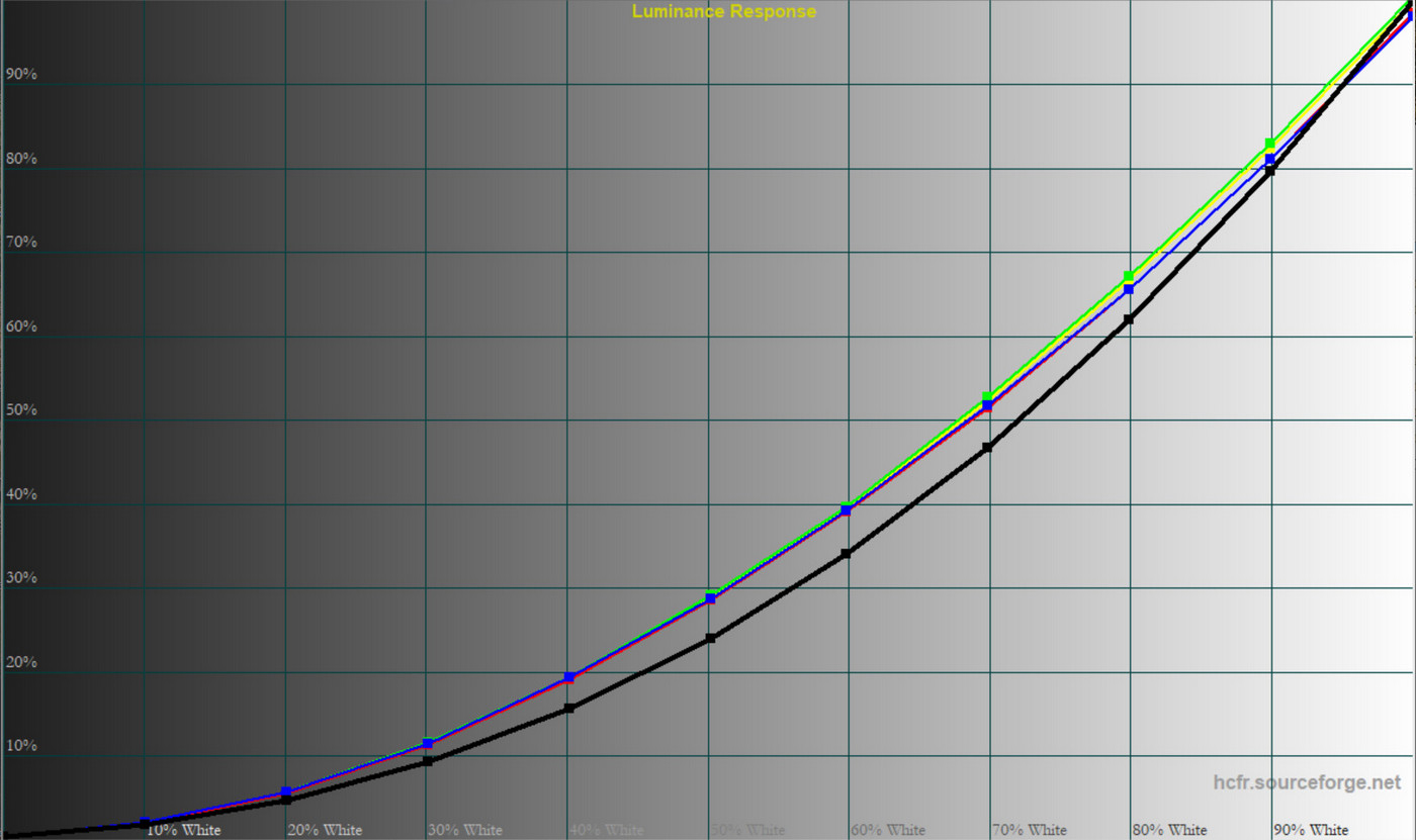 Загалом монітор демонструє контрольовану форму гама‑кривих, але у більшості профілів середні значення занижені. Це забезпечує більш приємну картинку для ігор, проте для роботи з кольором оптимальними залишаються саме «Pr‑Eco» та «Pr‑User».