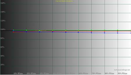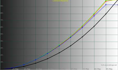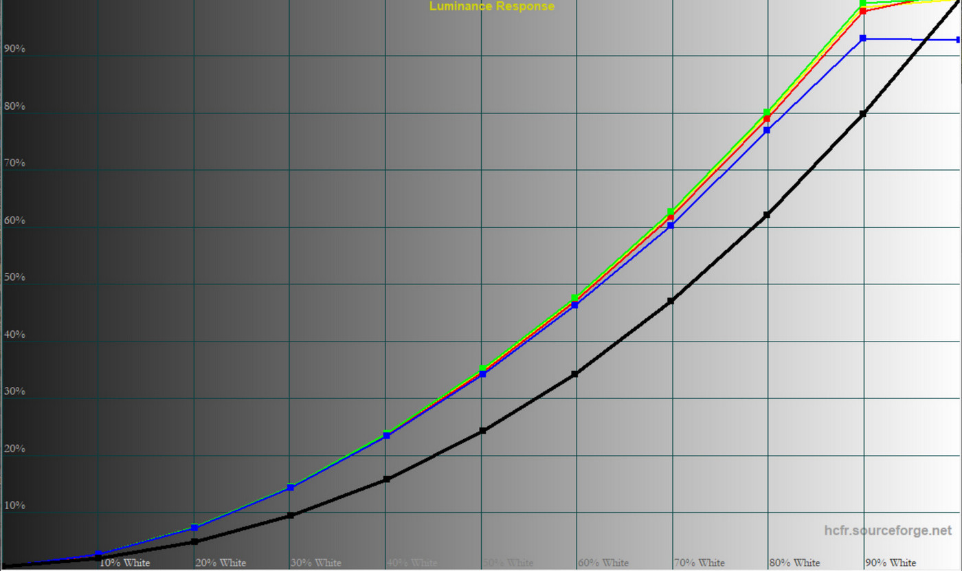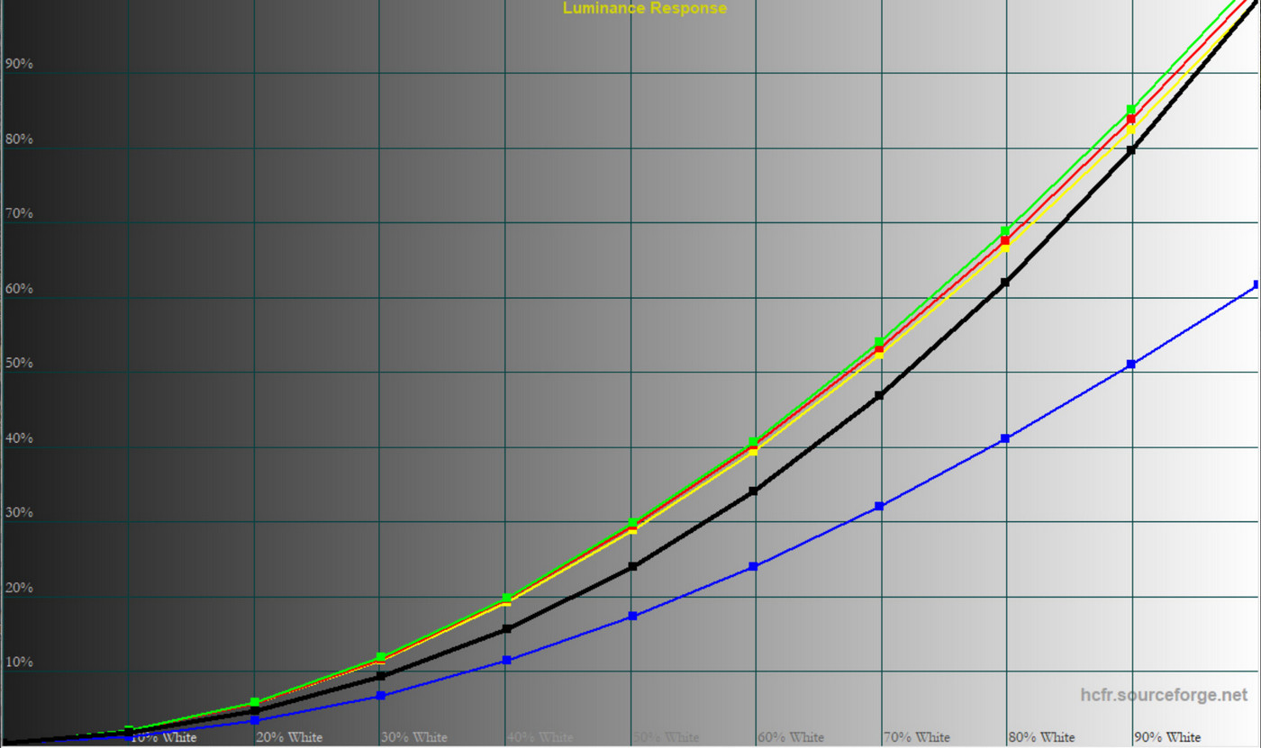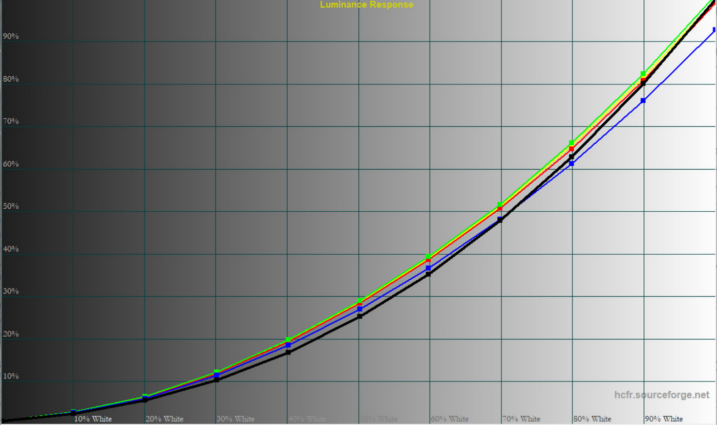 Загалом монітор демонструє контрольовану форму гама‑кривих, але у більшості профілів середні значення занижені. Це забезпечує більш приємну картинку для ігор, проте для роботи з кольором оптимальними залишаються саме «Pr‑Eco» та «Pr‑User».
