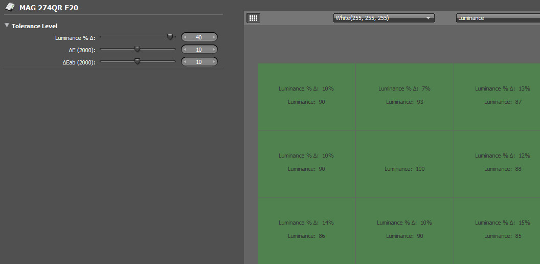 При ручному регулюванні через OSD діапазон яскравості становить від ~44 до ~374 кд/м². Мінімальне значення не є дуже низьким, тому для роботи в темряві бажано використовувати його разом із фоновим підсвічуванням стіни позаду монітора. Натомість максимальна яскравість однозначно дозволяє комфортно працювати навіть у яскравий сонячний день.