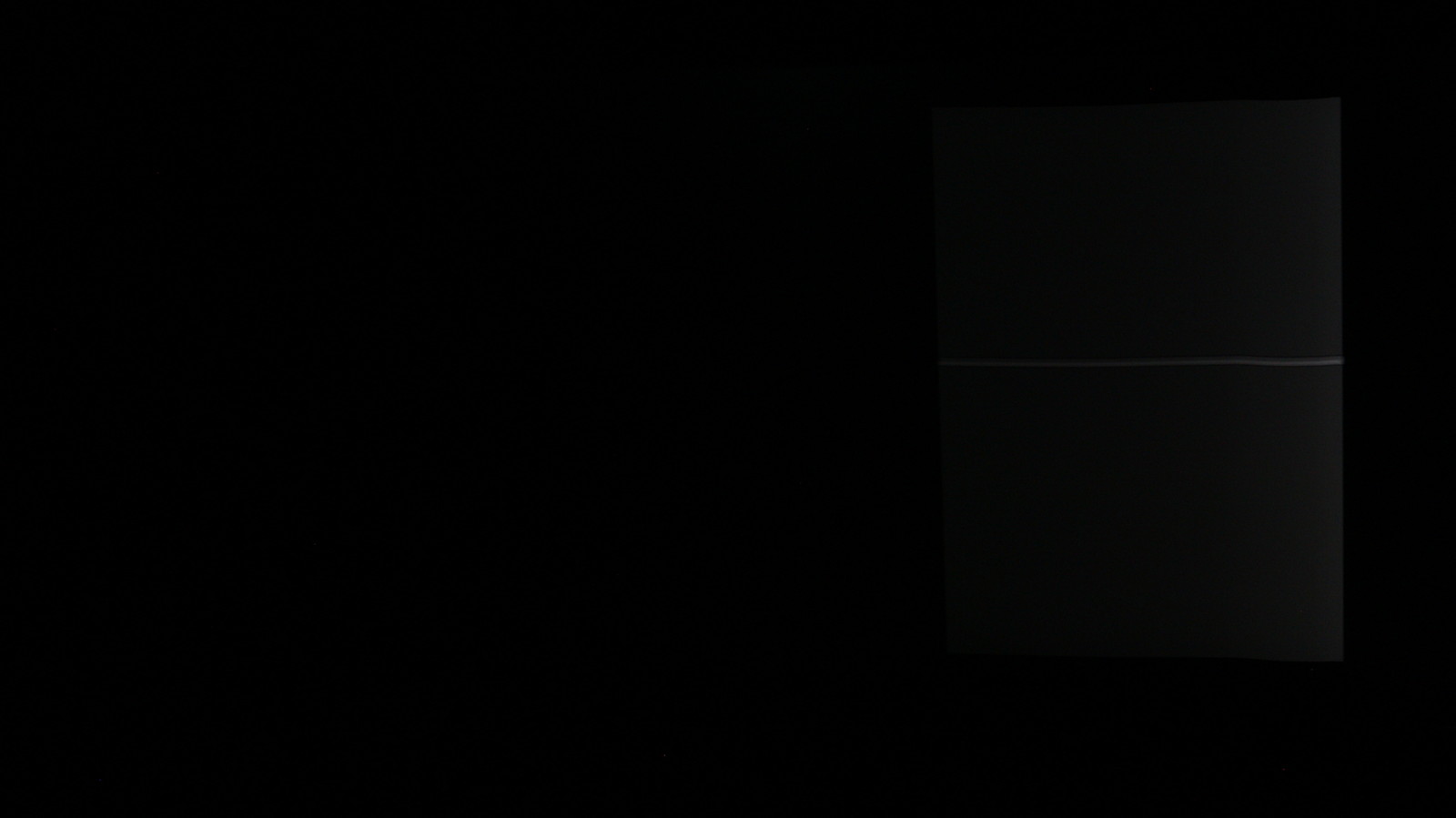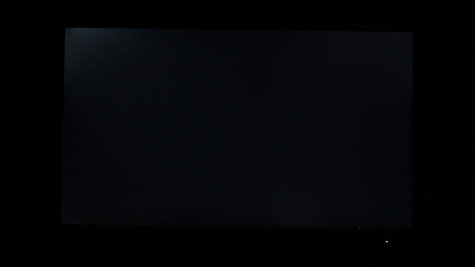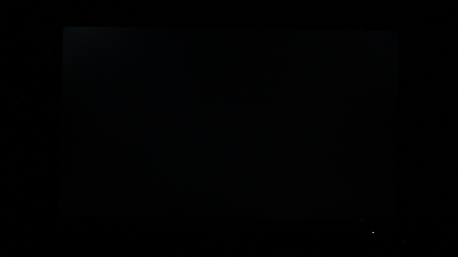 Засвіти на чорному екрані проявляються лише в умовах повної темряви. На першому фото видно реальну картину: фон рівномірно темний, без локальних підсвічувань чи світлих плям. Друге фото зроблене з довгою витримкою (1,6 с), що підсилює контраст і виводить на поверхню найменші відхилення — у лівому верхньому куті помітний локальний засвіт. У реальних умовах очима він виглядає значно менш вираженим, без критичних витоків світла, і не впливає на комфорт перегляду темних сцен.