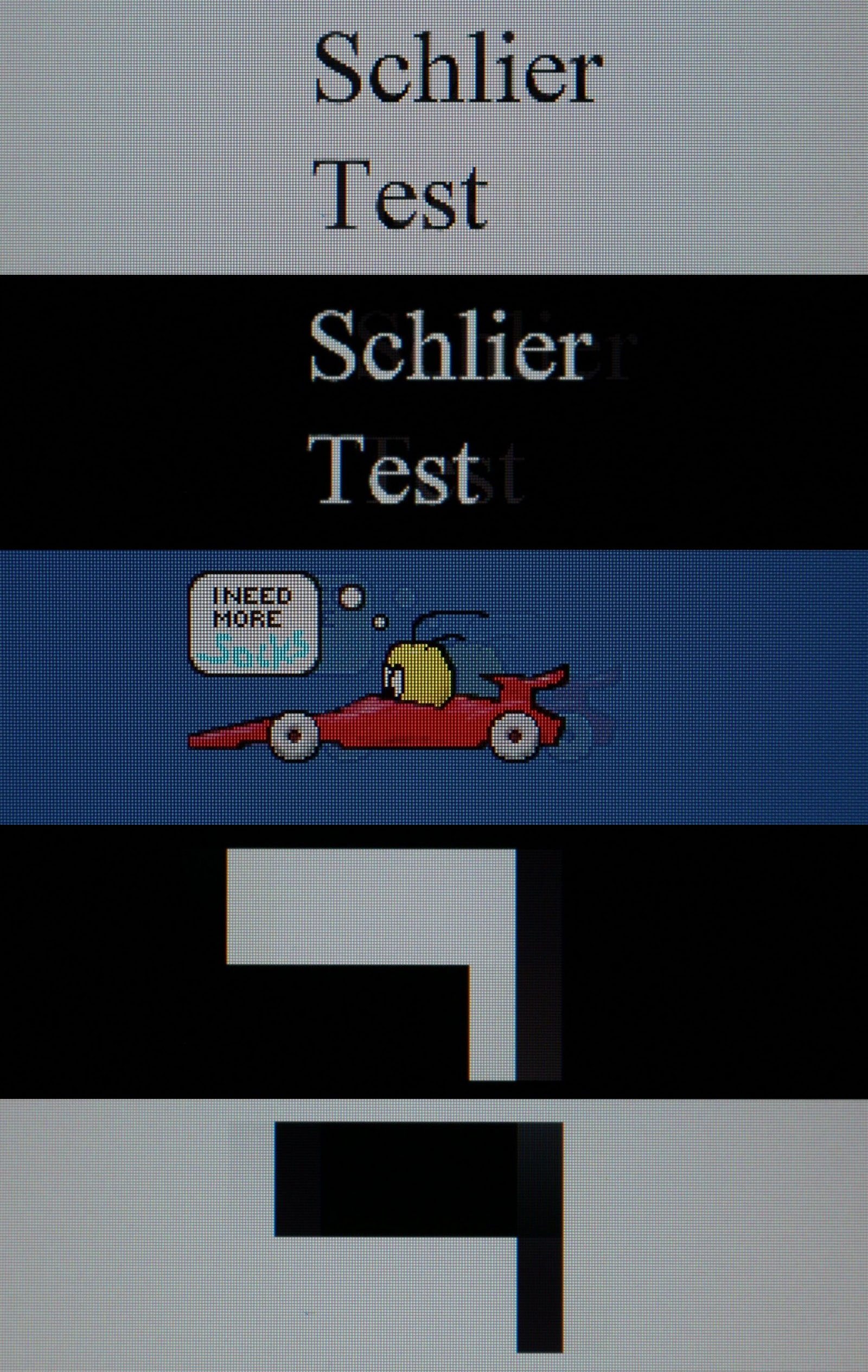 У динаміці монітор поводиться чітко, особливо в діапазоні від 120 до 200 Гц, де плавність руху відчувається найкраще. Під час Schlier‑тесту текстові блоки залишаються читабельними, без критичних шлейфів, а кольоровий об’єкт із машинкою демонструє лише легкі артефакти розгону. На темних переходах помітна невелика інерція, але без значних затримок чи інверсій. Така поведінка відповідає сучасному рівню IPS‑панелей: залишкові ефекти є помірними й не впливають на комфорт у динамічних сценах.