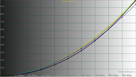 Крива зростання яскравості рівномірна на всьому діапазоні, без різких перегинів, що забезпечує передбачуване налаштування. Фактична зміна яскравості відчувається плавно й лінійно, навіть у верхньому діапазоні.