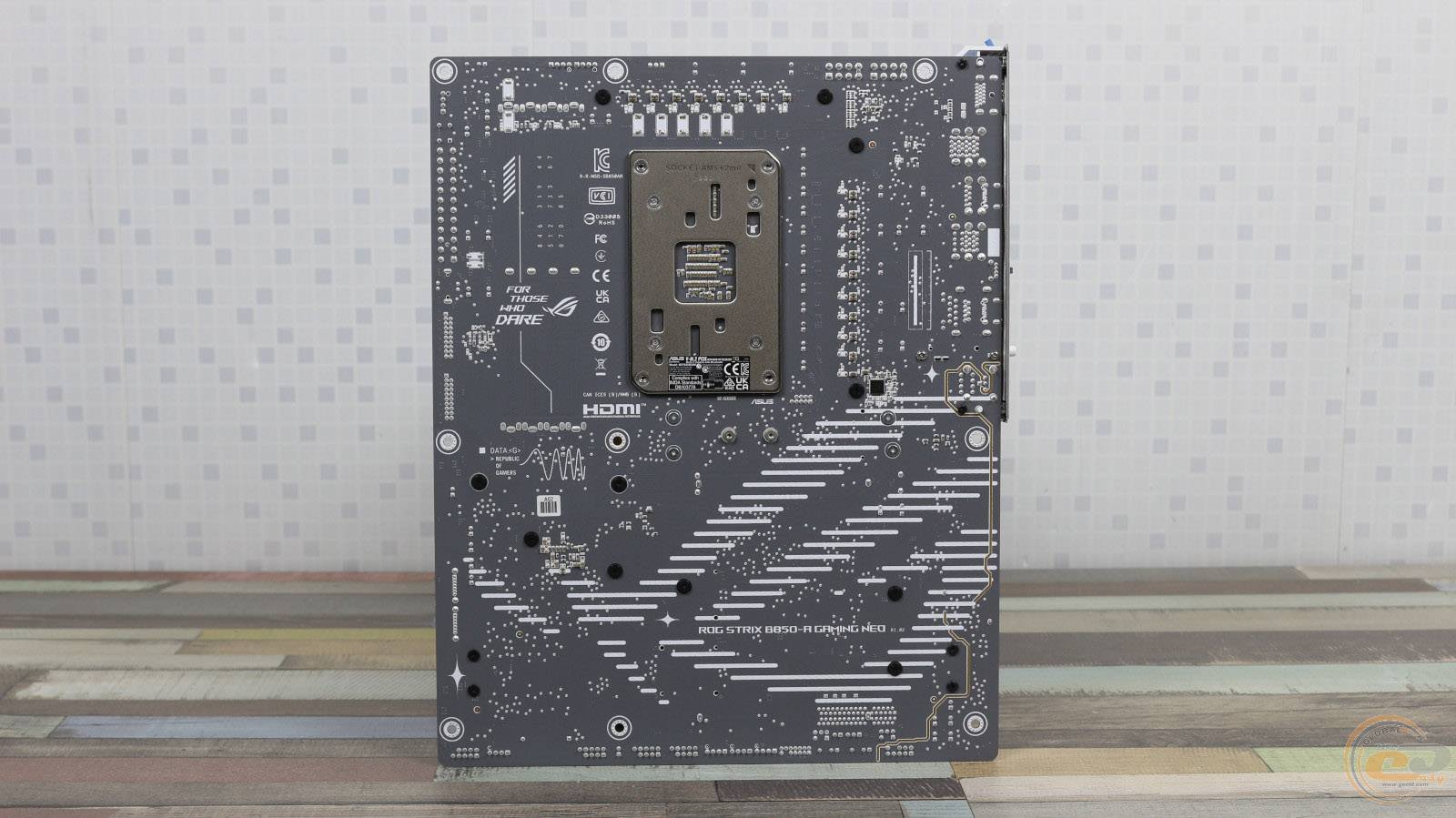 Зворотна сторона виконана у темно-сірому кольорі та розміщує стандартну опорну пластину процесорного роз’єму, гвинти кріплення радіаторів, а також ШІМ-контролер Richtek RT3672EE. Також тут можна побачити великий логотип ROG.