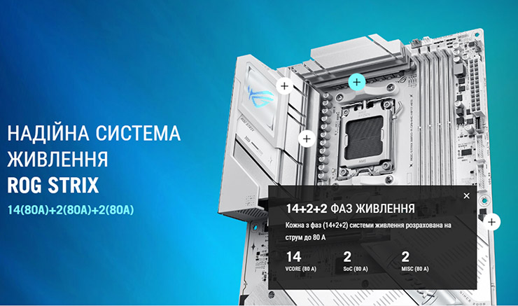 ASUS ROG STRIX B850-A GAMING WIFI7 NEO отримала 14 (80 А) + 2 (80 А) + 2 (80 А)-фазну схему живлення.