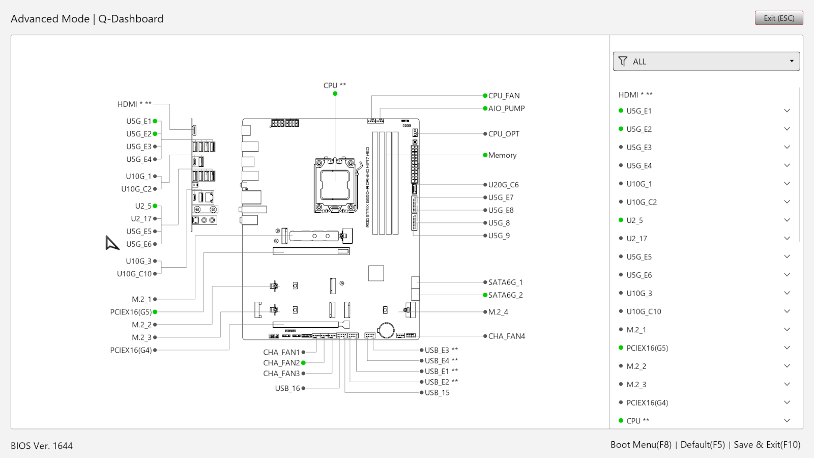 У правому нижньому куті присутній пункт «Q-Dashboard», що надає користувачу схематичний огляд усіх підключених до материнської плати пристроїв.