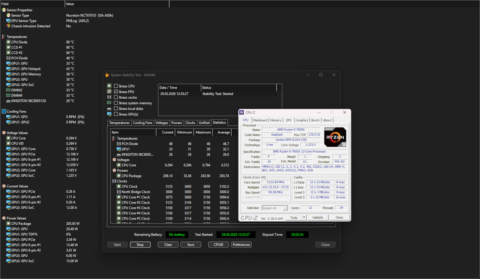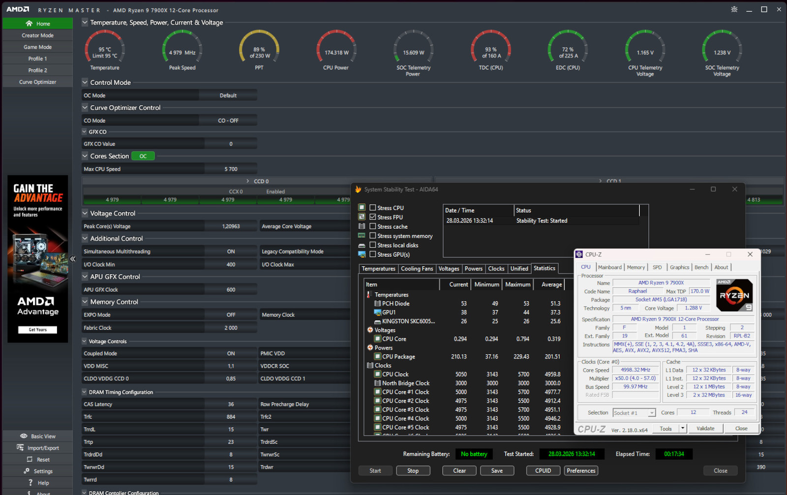 Більш вимогливий Stress FPU у програмному забезпеченні AIDA64 зменшив частоту процесора до 5 ГГц при напрузі у 1,288 В. При цьому процесор працював у штатному режимі та в середньому споживав 201,5 Вт.