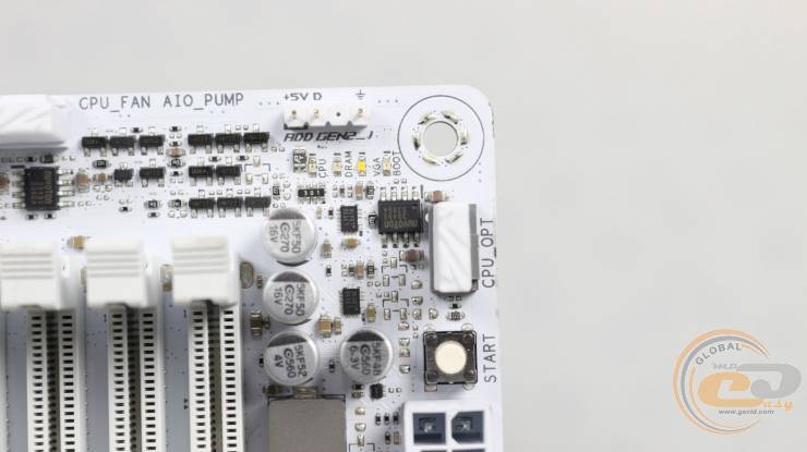 Ближче до верхнього кута плати можна побачити кнопку запуску системи, діагностичні світлодіодні індикатори та один роз'єм для ARGB-світлодіодної стрічки.