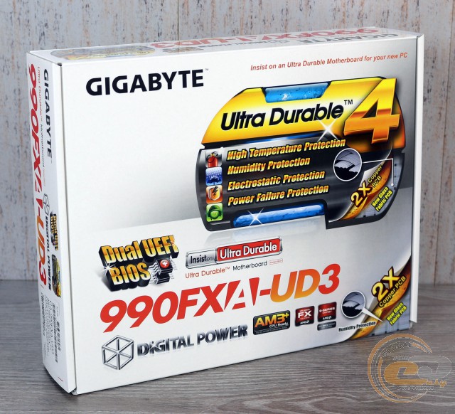Материнська плата GIGABYTE GA-990FXA-UD3 постачається в традиційній коробці зі щільного картону з оформленням у світлих тонах. При погляді на упаковку, в першу чергу привертає до себе увагу назва моделі та компанії-виробника, а також логотип фірмової концепції Ultra Durable 4, яка включає до свого складу наступні особливості:
