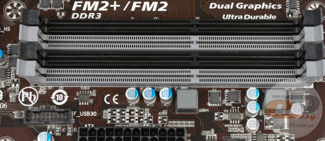 Що ж стосується особливостей тестованої моделі, то варто відзначити відсутність отвору під кріпильний гвинт у правому нижньому куті текстоліту, не найоптимальніший розподіл ліній PCI Express x16 у випадку встановлення двох відеокарт, а також некоректну роботу датчика напруги на процесорі при розгоні APU AMD Trinity.