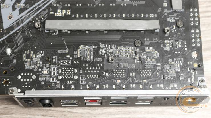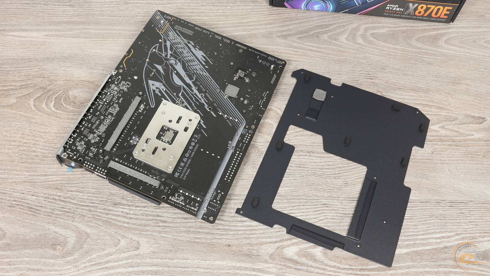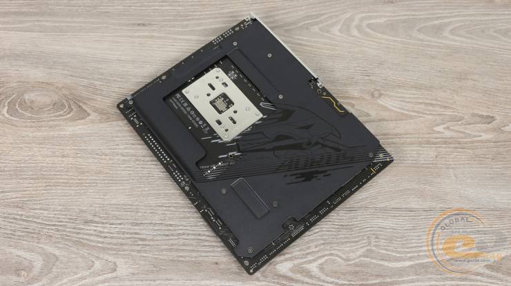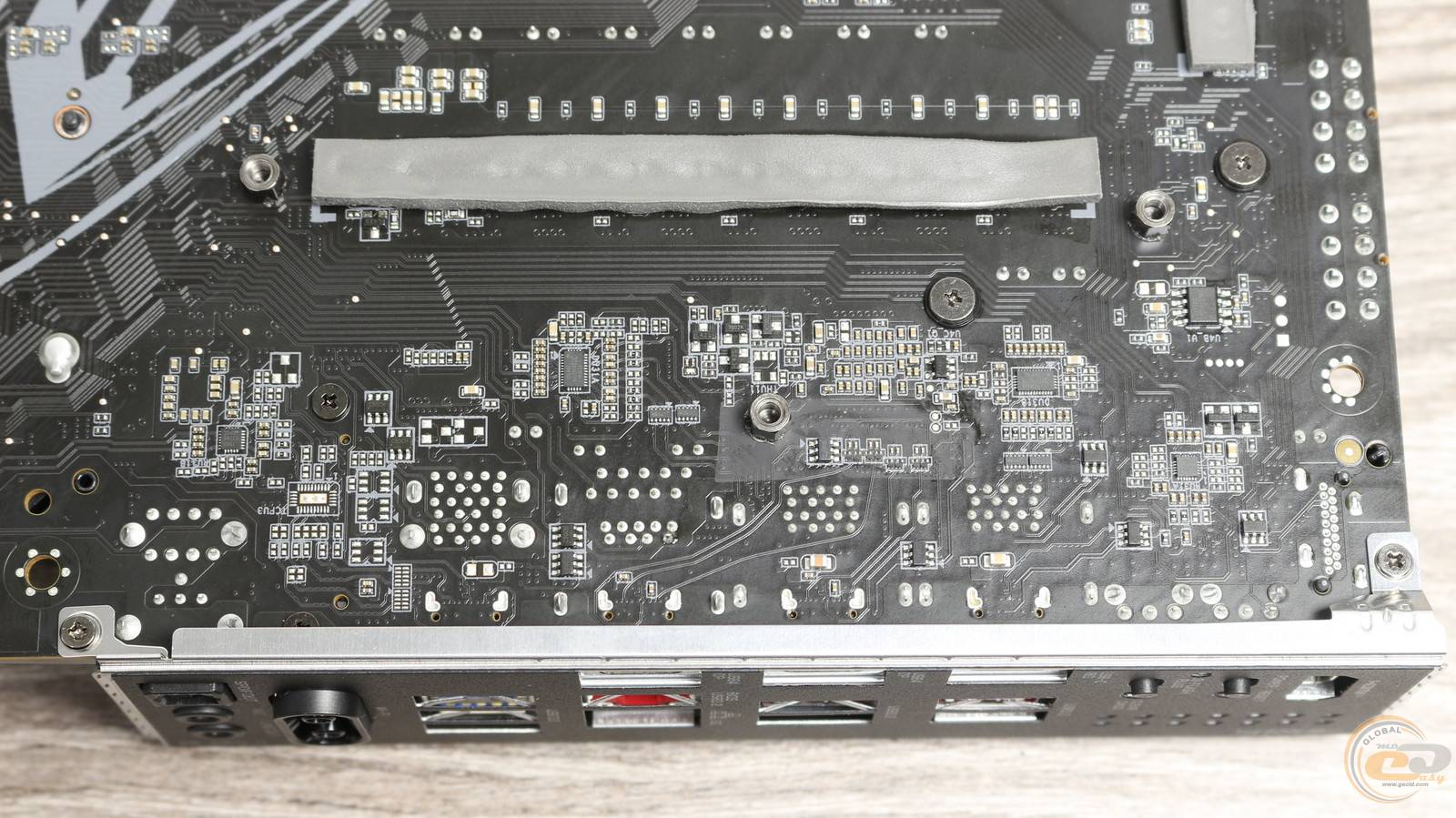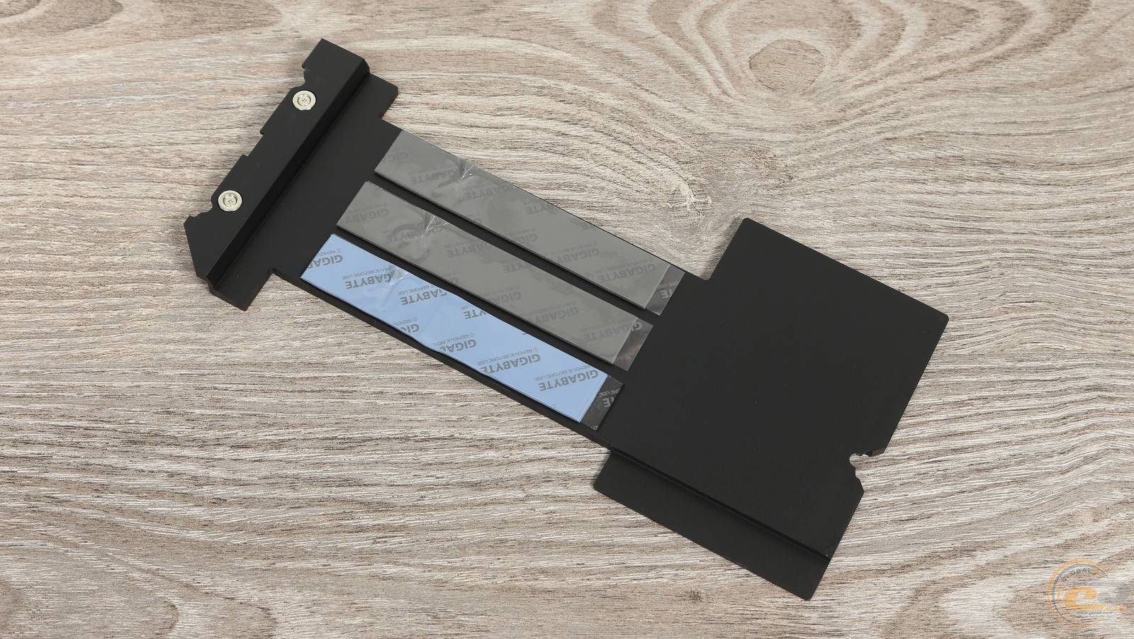 Так, ключове її завдання — додаткове відведення тепла від гарячих елементів, розташованих на лицьовій стороні. Це стосується складових вузла VRM та чипсету — у відповідних місцях пластина отримала заглиблення, а передача тепла відбувається через термопрокладки.