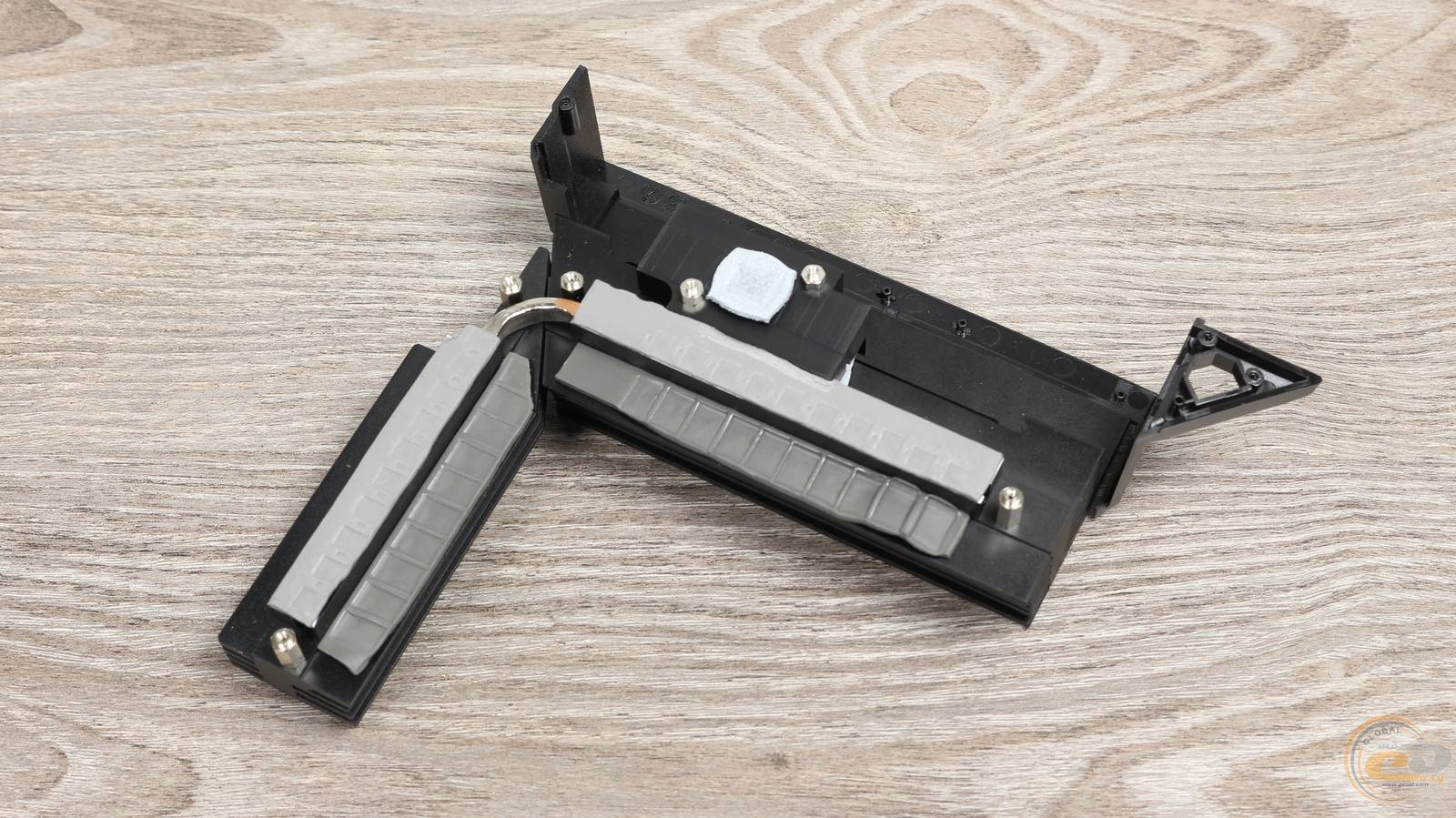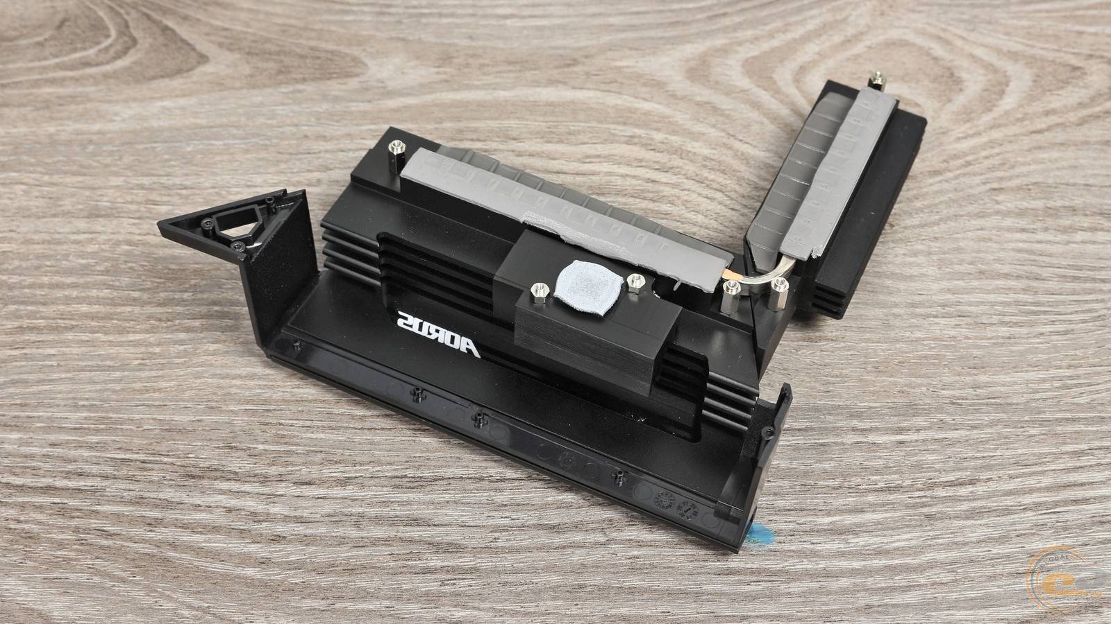 Для кращої ефективності вони доповнені тепловою трубкою, що з'єднує їх в одне ціле. На місці є і термопрокладки для відведення тепла від дроселів та транзисторів, в тому числі і з високою теплопровідністю 7 Вт/(м·К). А ще один квадратний елемент передає тепло від мікросхеми ASMedia, яка відповідає за роботу портів USB 4.