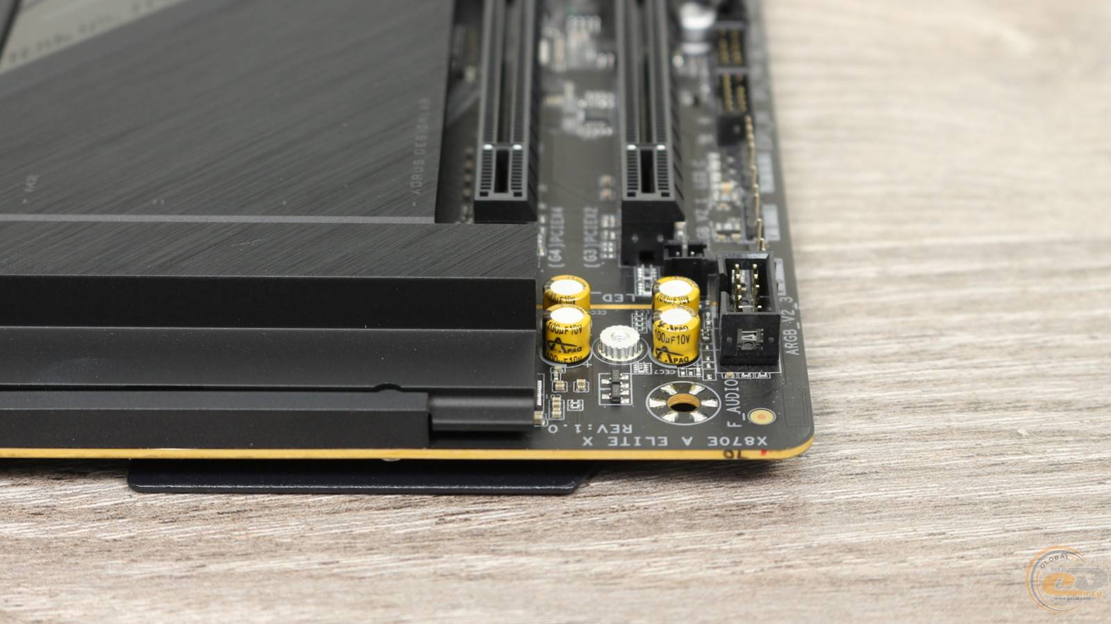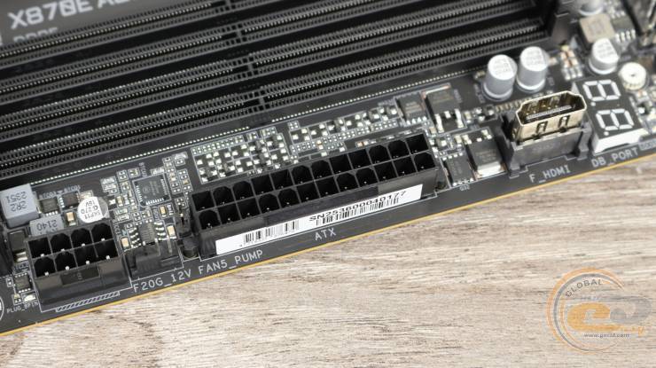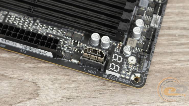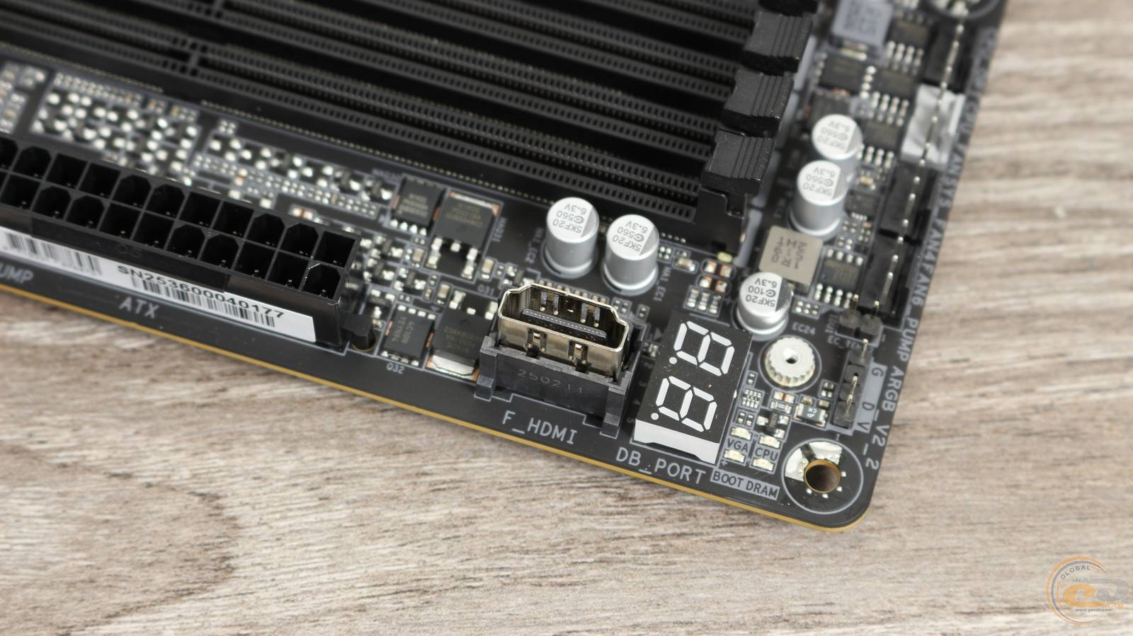 А вздовж правого краю розпаяна колодка під’єднання адресної LED-підсвітки, чотири індикатори завантаження системи, табло виведення діагностичних кодів, роз'єм HDMI, 24-контактний роз’єм живлення ATX, ще один 4-контактний FAN-конектор з можливістю під'єднання помпи та 8-контактний роз'єм живлення PCIe. Під'єднання останнього дозволить використовувати розташований нижче фронтальний порт USB 3.2 Gen 2x2 для швидкої зарядки потужністю до 65 Вт.