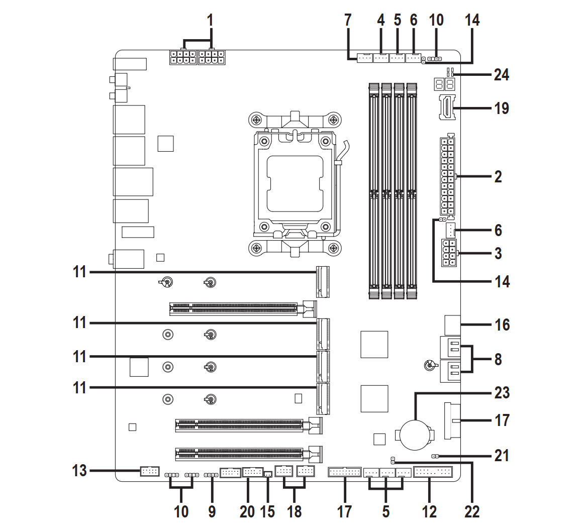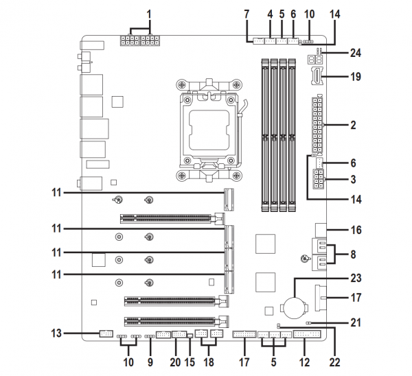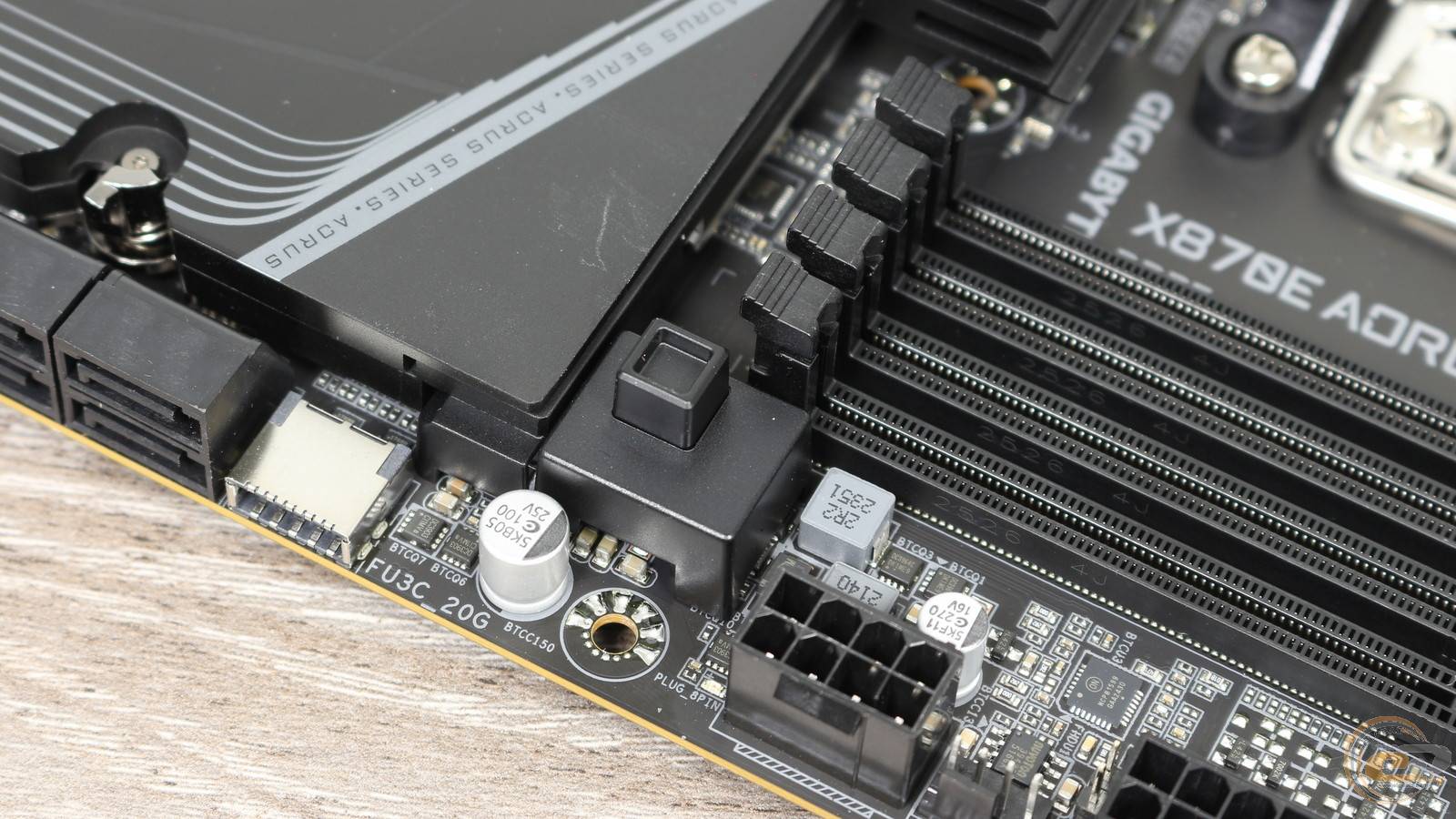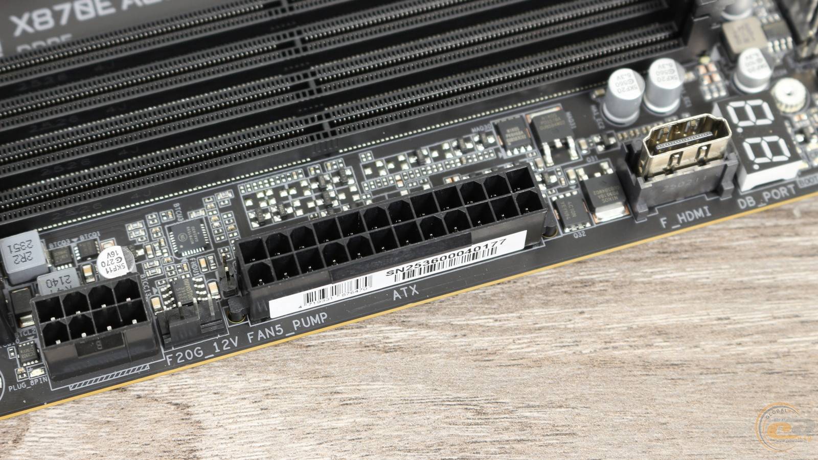 А вздовж правого краю розпаяна колодка під’єднання адресної LED-підсвітки, чотири індикатори завантаження системи, табло виведення діагностичних кодів, роз'єм HDMI, 24-контактний роз’єм живлення ATX, ще один 4-контактний FAN-конектор з можливістю під'єднання помпи та 8-контактний роз'єм живлення PCIe. Під'єднання останнього дозволить використовувати розташований нижче фронтальний порт USB 3.2 Gen 2x2 для швидкої зарядки потужністю до 65 Вт.