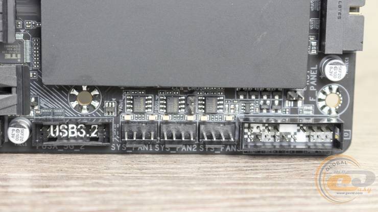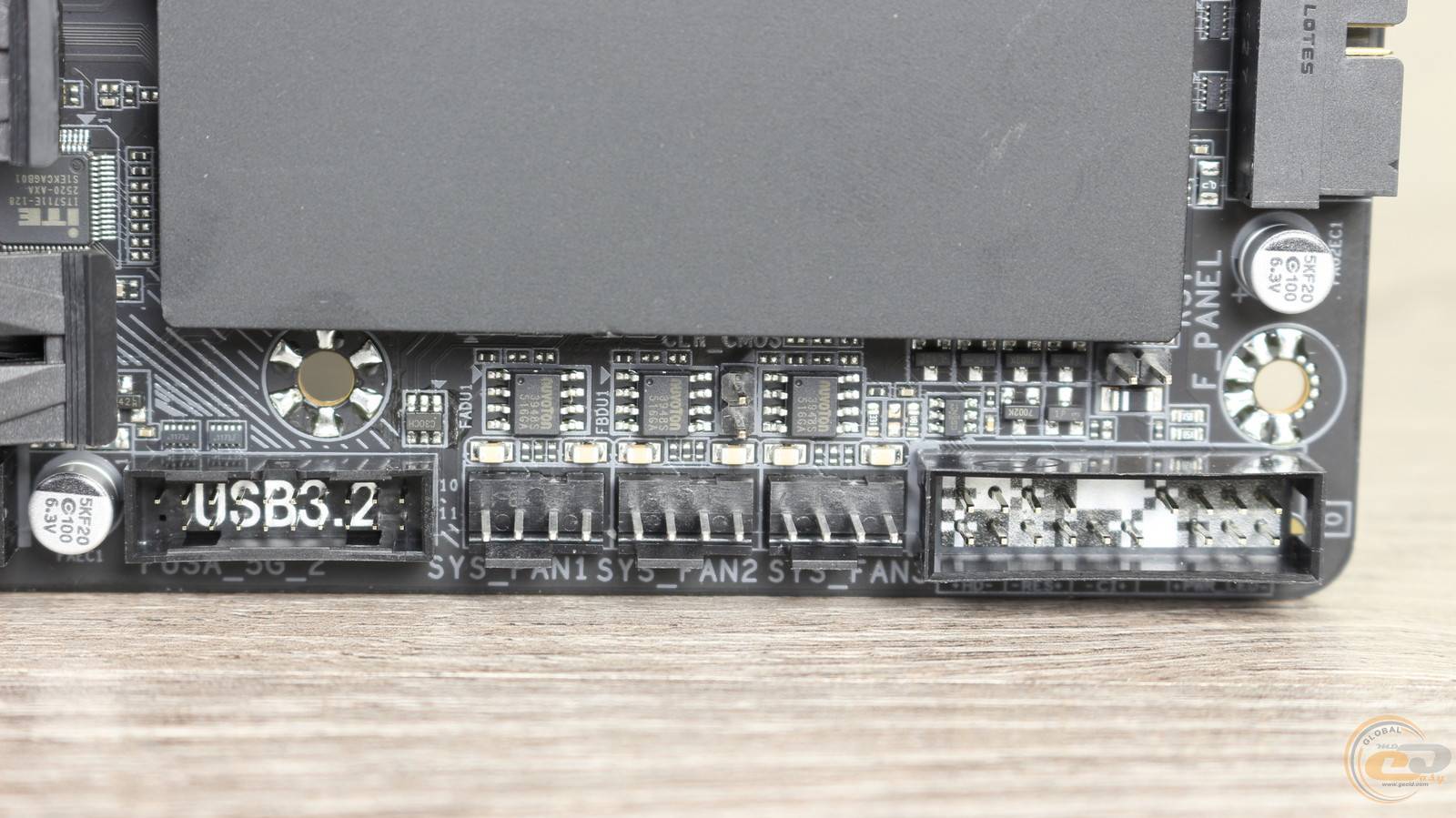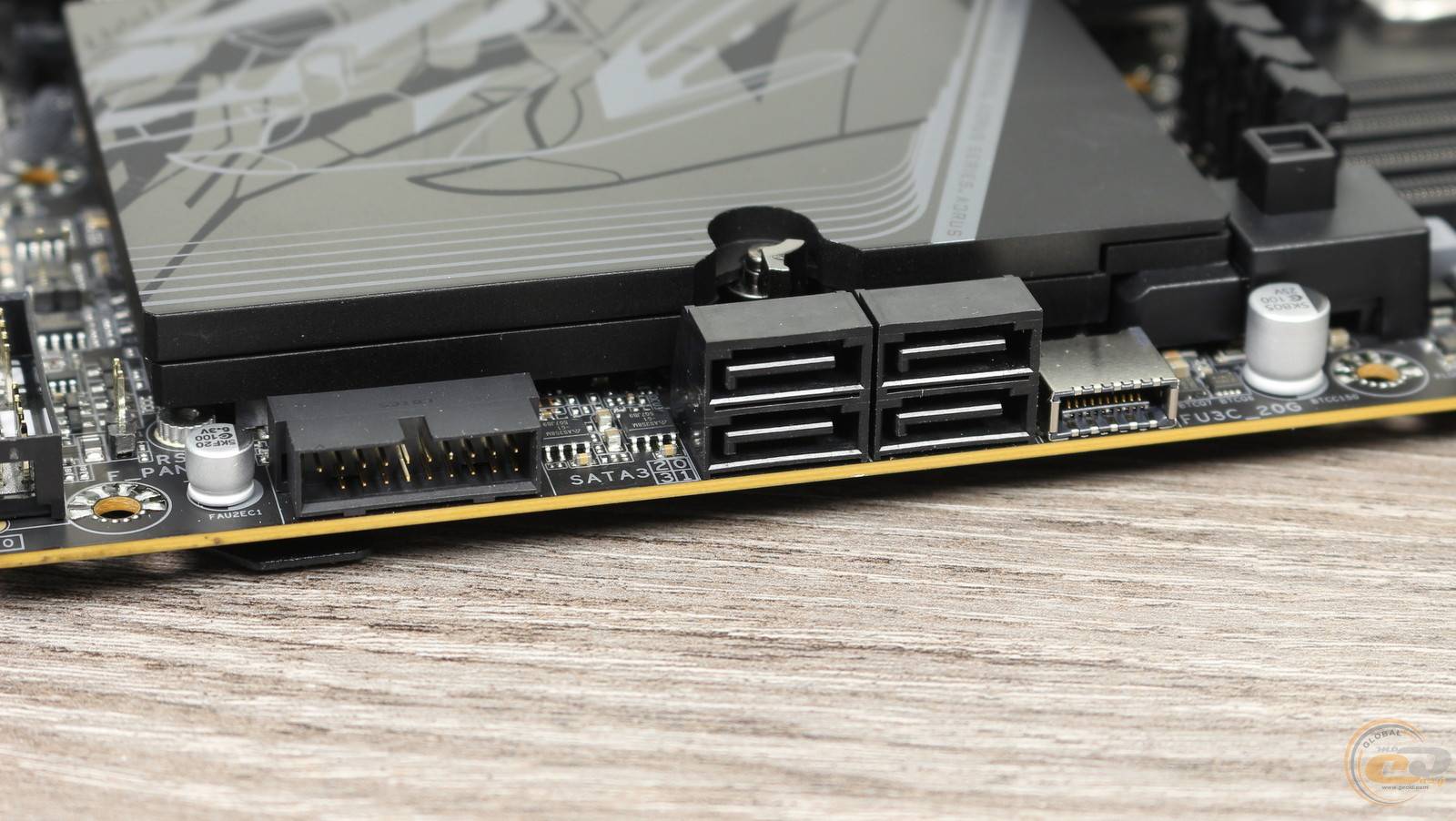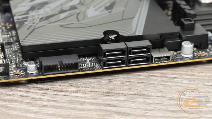 Ще нижче вздовж правого краю розташувалися колодки фронтальних USB 3.2 Gen 2x2 та USB 3.2 Gen 1. Останні призначені для під’єднання відповідно USB Type-C з пропускною здатністю до 20 Гбіт/с та двох USB 3.2 Gen 1 зі швидкістю 5 Гбіт/с. А між ними розпаяні чотири порти SATA 6 Гбіт/с з горизонтальним компонування, що дозволить використовувати їх навіть при встановленні габаритної відеокарти.