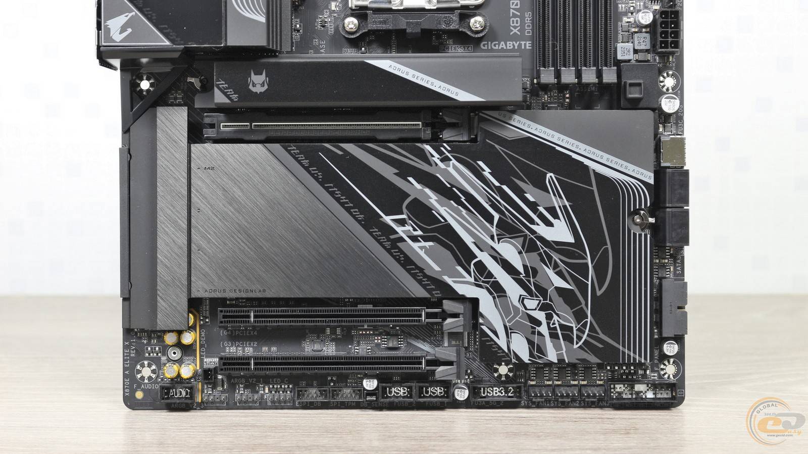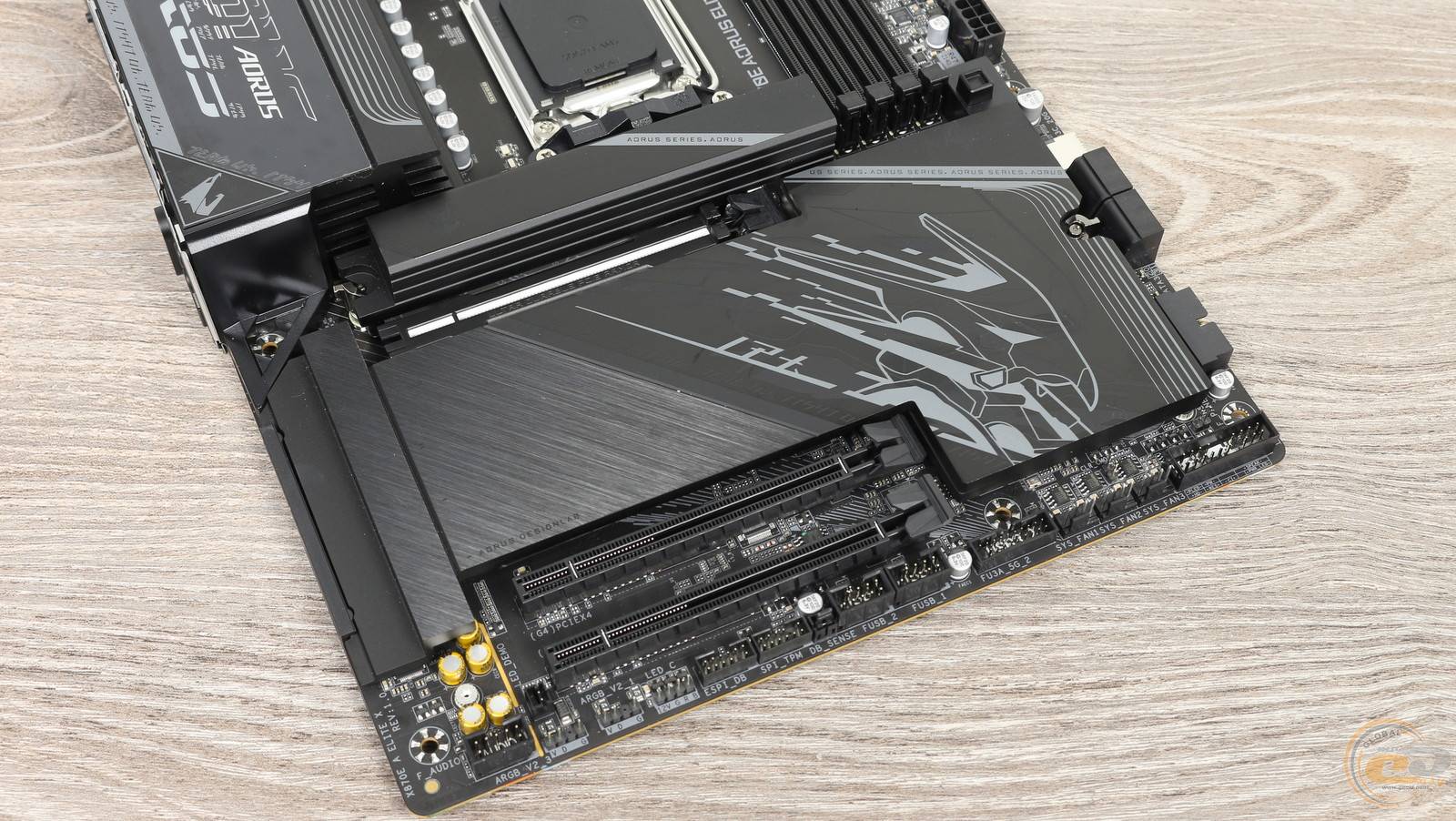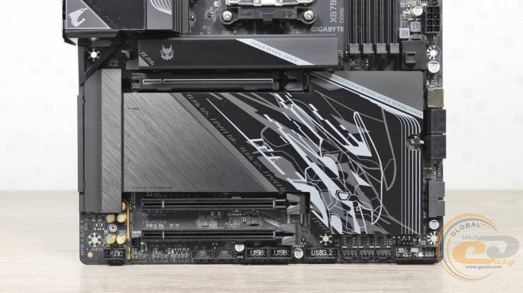 Ще три слоти M.2 Socket 3 розташувалися нижче PCI Express 5.0 x16. Верхній із них відповідає стандарту PCIe 5.0 x4, тож накопичувач тут також охолоджується з обох боків. Втім, при задіюванні портів USB 4 на тильній панелі для встановленого сюди SSD буде доступно лише дві лінії замість чотирьох. А у парі з процесорами Ryzen 8000 він і зовсім буде неактивним.