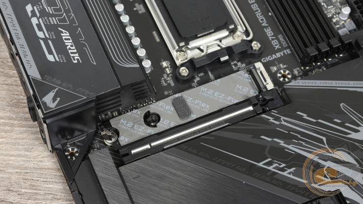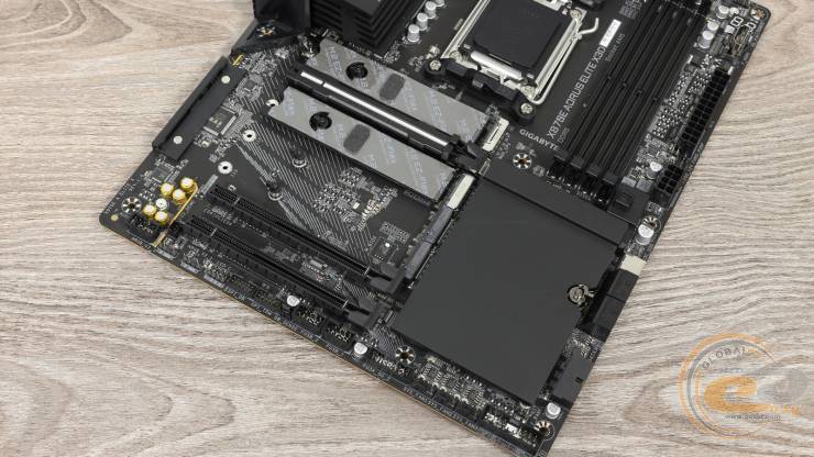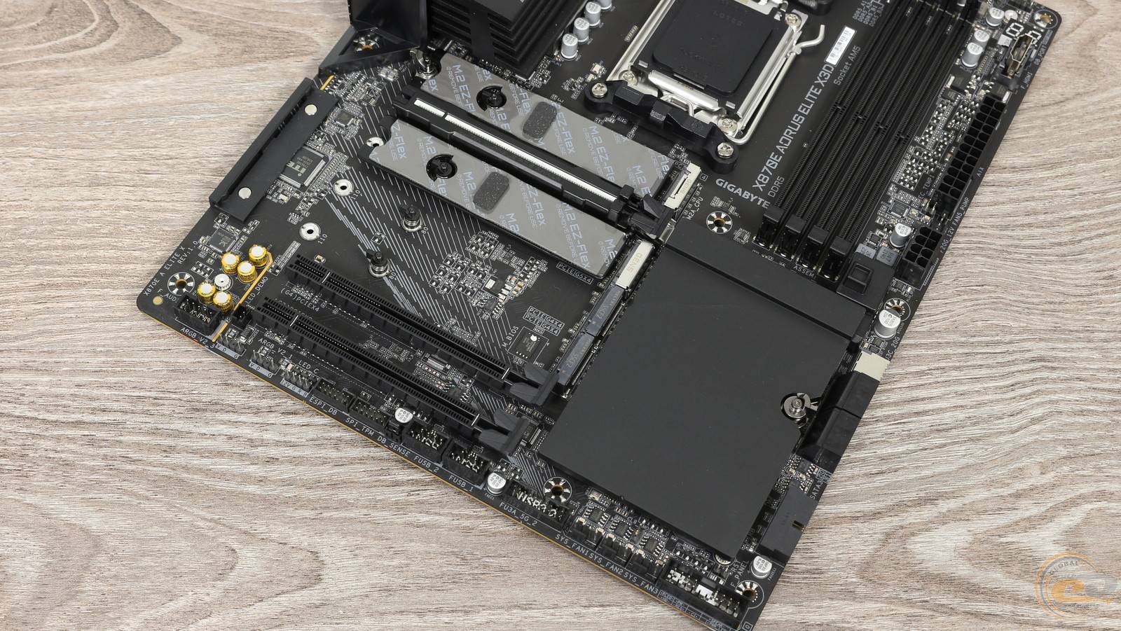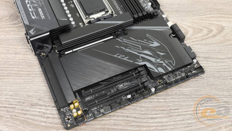 Також плата може похвалитися аж чотирма слотами M.2 Socket 3. Верхній із них розташований вище PCI Express 5.0 x16 і підтримує накопичувачі формату M.2 22110 / 2280 / 25110 / 2580. Два останні, як можна здогадатися із назви, мають більшу ширину — 25 мм замість звичних 22 мм. Кріплення радіатора та SSD відбувається безгвинтовим способом, а через термопрокладки тепло від носія буде відводитися водночас зверху та знизу.