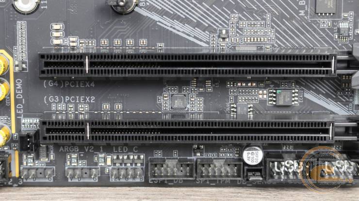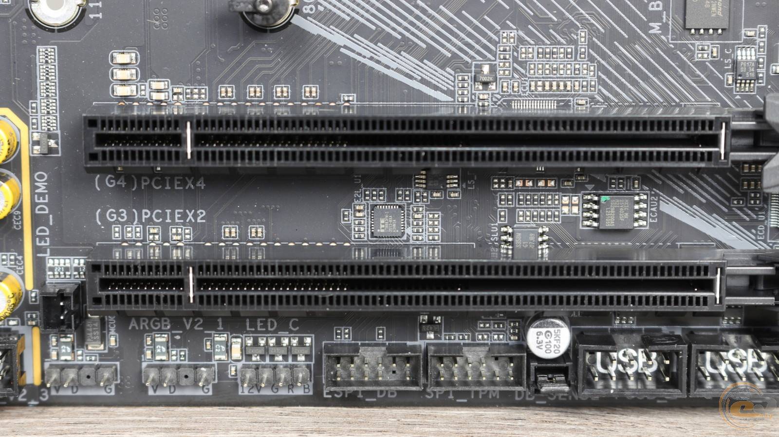 В свою чергу два нижні слоти працюють завдяки чипсету, тож тут стабільно маємо PCIe 4.0 x4.