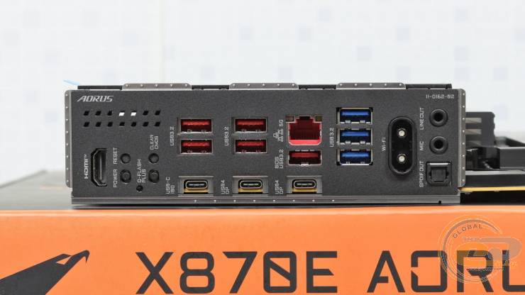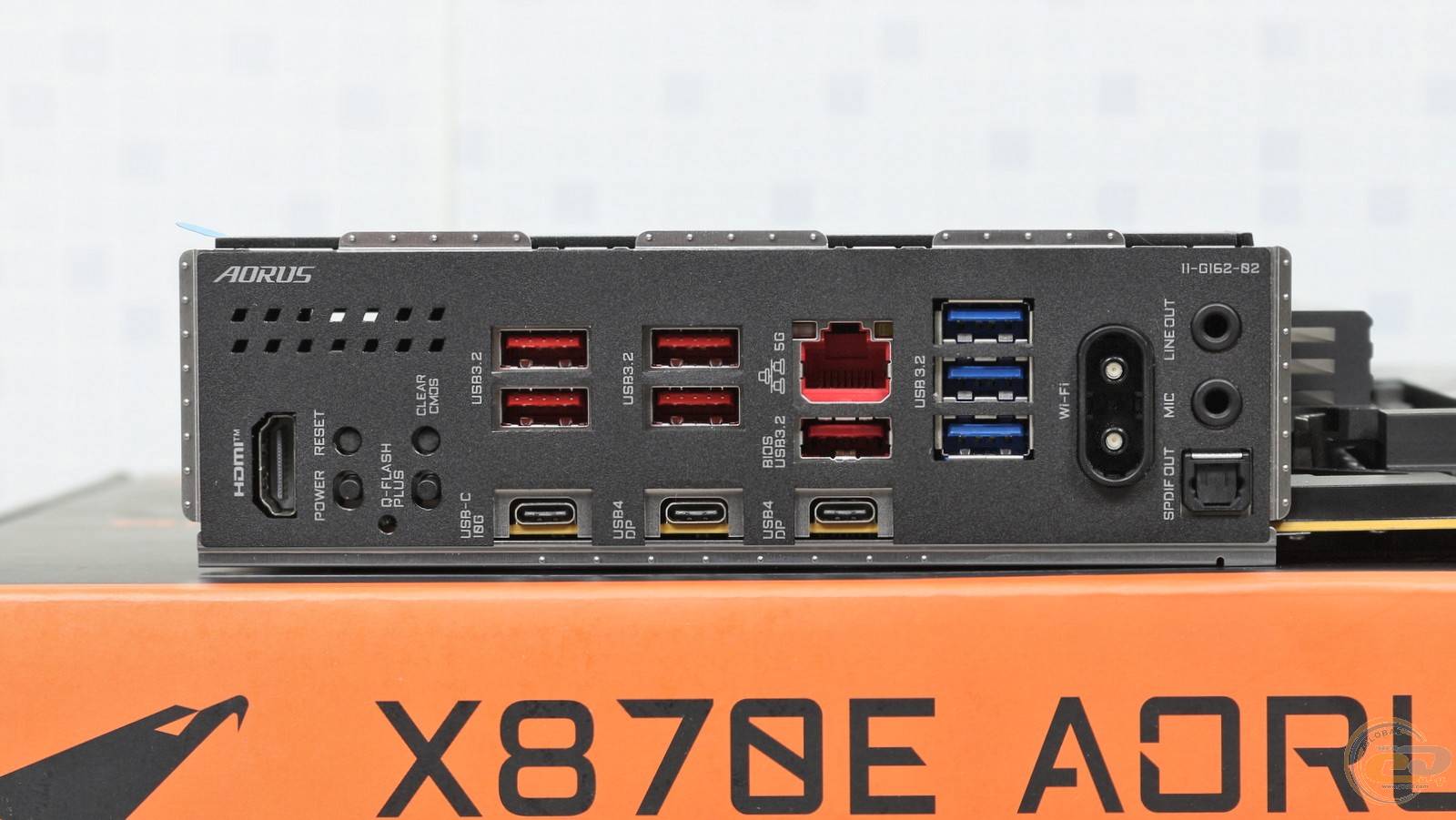 І нарешті кілька рядків про інтерфейсну панель GIGABYTE X870E AORUS ELITE X3D. Сюди виведені наступні порти та елементи: