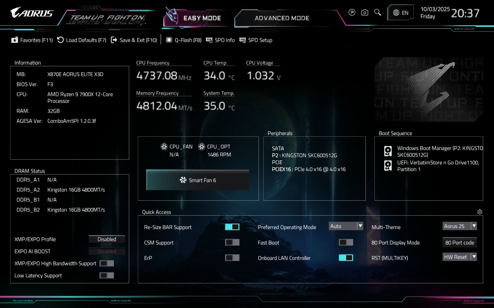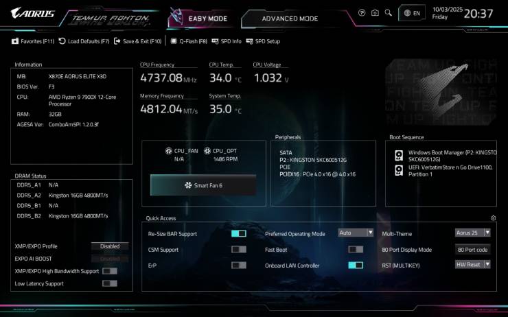 Тестована плата GIGABYTE X870E AORUS ELITE X3D використовує сучасний завантажувач на основі графічного інтерфейсу UEFI. Традиційно доступні два режими роботи. У «Easy Mode» всі налаштування згруповані на одному екрані.