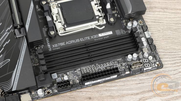 Ближче до слотів пам’яті GIGABYTE X870E AORUS ELITE X3D розташовані чотири 4-контактні FAN-конектори: основний і додатковий для процесорного охолоджувача та пара корпусних, один із яких підтримує під'єднання помпи водоблока.