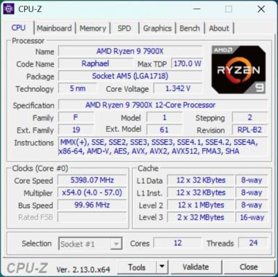 При навантаженні 12-ядерного AMD Ryzen 9 7900X стрес-тестом утиліти CPU-Z, він тримав стабільні 5,35 ГГц за напруги 1,265 В.