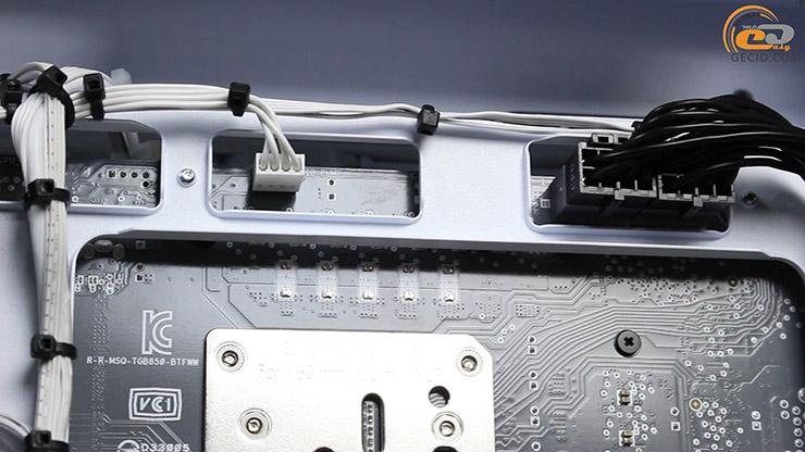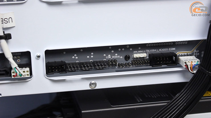 Тут опинилися і інтерфейси живлення, і SATA, і внутрішні USB, і навіть новий GC_HPWR для відеокарт, здатний передати до 600 Вт потужності. Лише конектор для кулера процесора залишився на лицьовій частині самої плати.