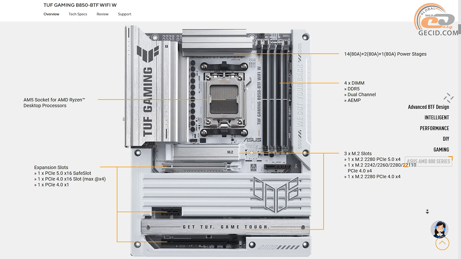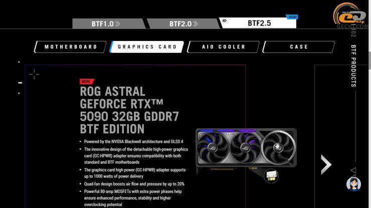Модель належить до концепції BTF 2.5, що передбачає використання знімного адаптера GC-HPWR, здатного витримувати навантаження до 1000 Вт, і збереження звичного роз’єму 12VHPWR - сумісна заглушка йде в комплекті.