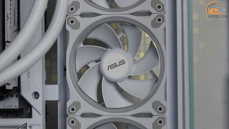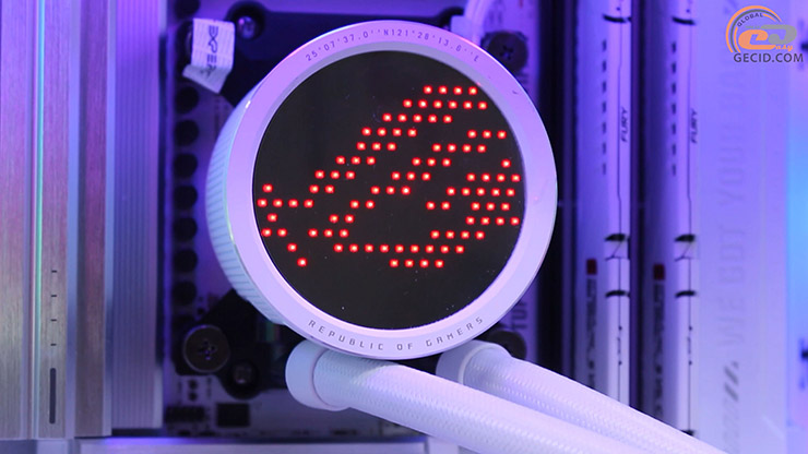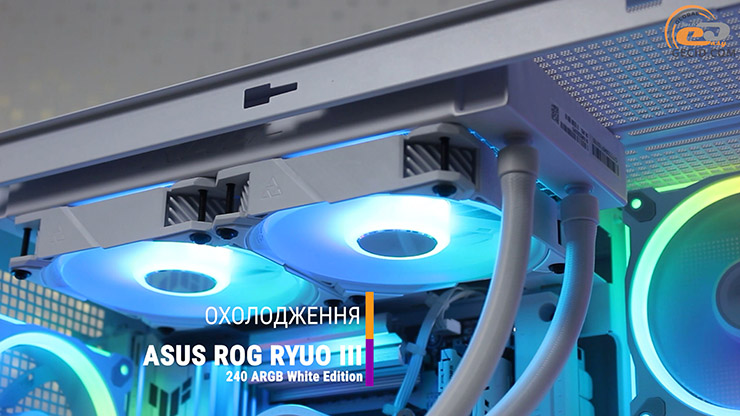 Охолоджує процесор ефектна система рідинного охолодження ASUS ROG RYUO III 240 ARGB White Edition, яка сумісна з платформою, хоч і не є рекомендованою до BTF-систем. Вона отримала 240-міліметровий радіатор покращеної конструкції, пару 120-мм ARGB-вентиляторів і новий водоблок із 3,5-дюймовим кольоровим дисплеєм Anime Matrix для відображення ексклюзивної анімації, параметрів системи або власного контенту.