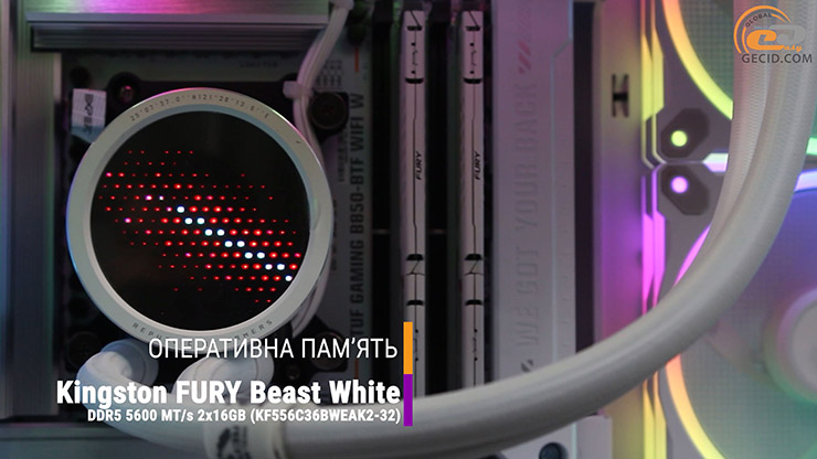 За зберігання оперативних даних відповідає пара модулів Kingston FURY Beast White DDR5 загальним обсягом 32 ГБ зі швидкістю 5600 МТ/с та прийнятними таймінгами. Модулі мають стильний білий радіатор і підтримку профілів AMD EXPO, тобто оптимізовані саме під цю платформу. Ми вирішили ї трішки прискорити до оптимальних 6000 МТ/c, що вийшло зробити при таймінгах 36-44-44 і напрузі 1,35 В.