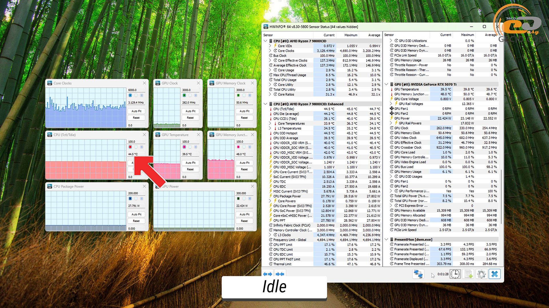 Під час простою відеокарта та процесор перебували у стані спокою та грілися на 37 та 44 з поливною градуса відповідно. Ніяких несподіванок тут немає.